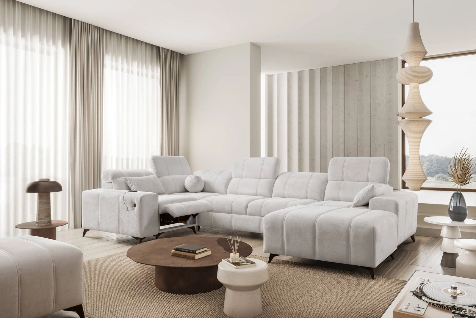 Dodatki tego mebla, które docenią wszyscy użytkownicy to wysuwany podnóżek, pojemnik na pościel, funkcja spania oraz gniazdo ładowania USB w boczku narożnika.