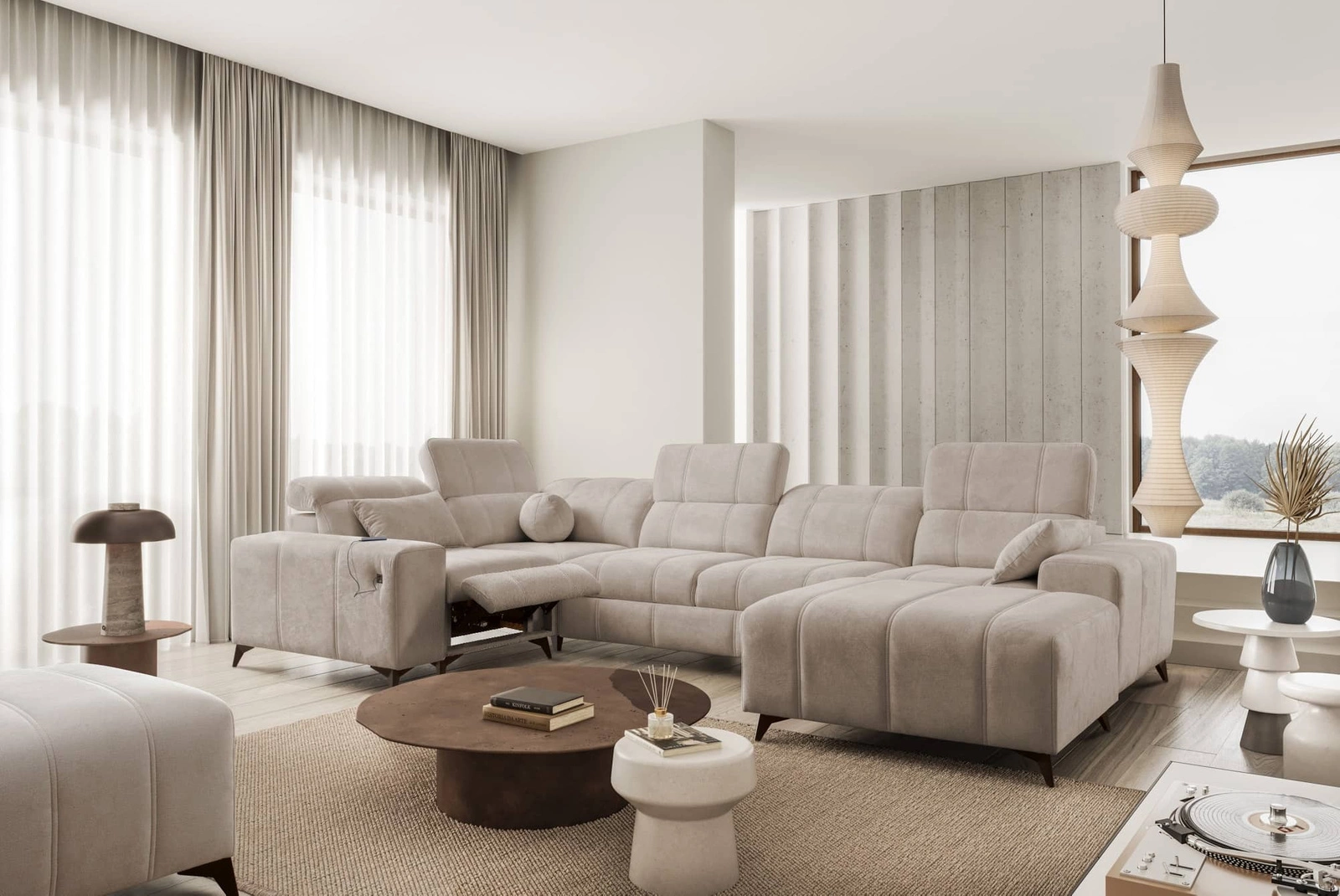 Narożnik Penejos IV Lux w kolorze ciemny beżowy z wysuwanym podnóżkiem to niezwykle komfortowy mebel o ciekawym wykończeniu.