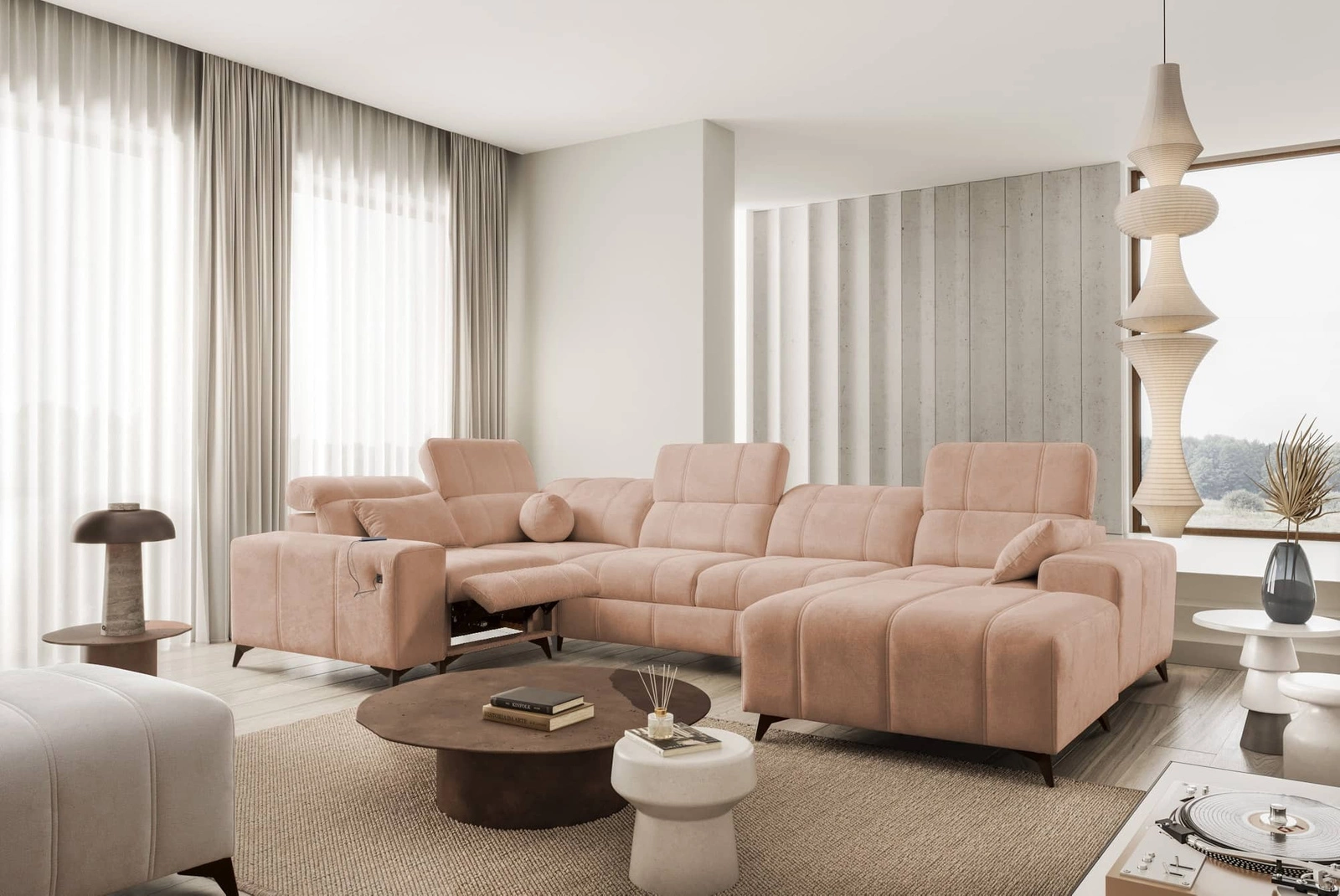 Narożnik Penejos IV Lux w kolorze łososiowym z wysuwanym podnóżkiem to niezwykle komfortowy mebel o ciekawym wykończeniu.