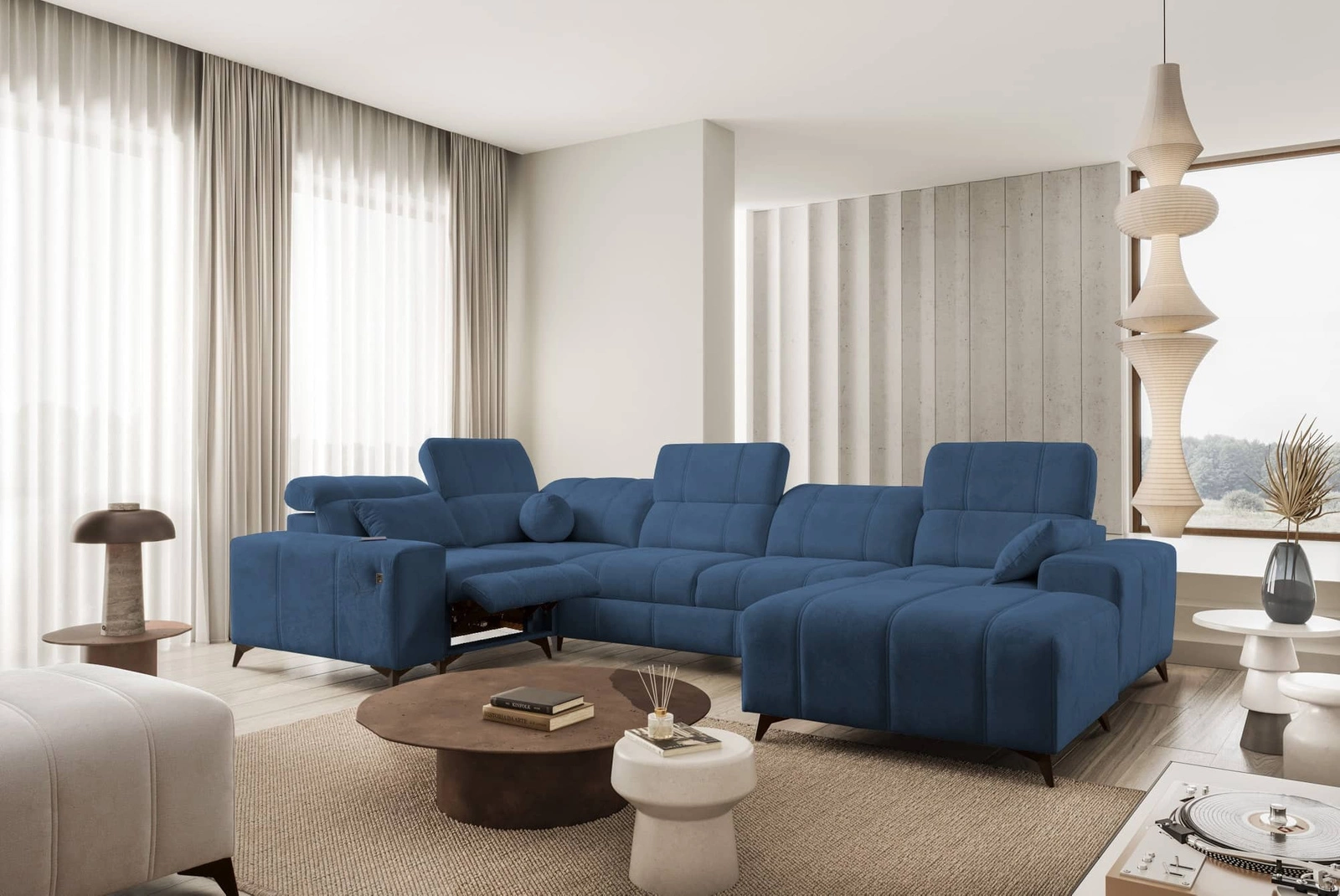 Narożnik Penejos IV Lux w kolorze niebieskim z wysuwanym podnóżkiem to niezwykle komfortowy mebel o ciekawym wykończeniu.