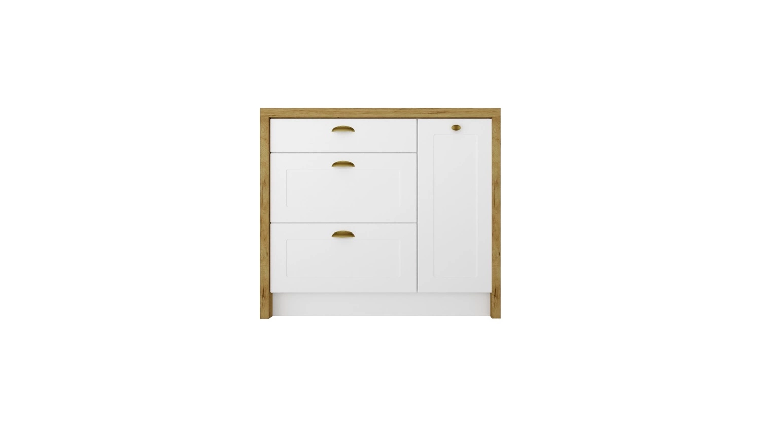 Wyspa kuchenna z szufladami Adele 97 cm dąb artisan / biały funkcjonalny mebel kuchenny odporny na działanie wilgoci metalowe uchwyty
