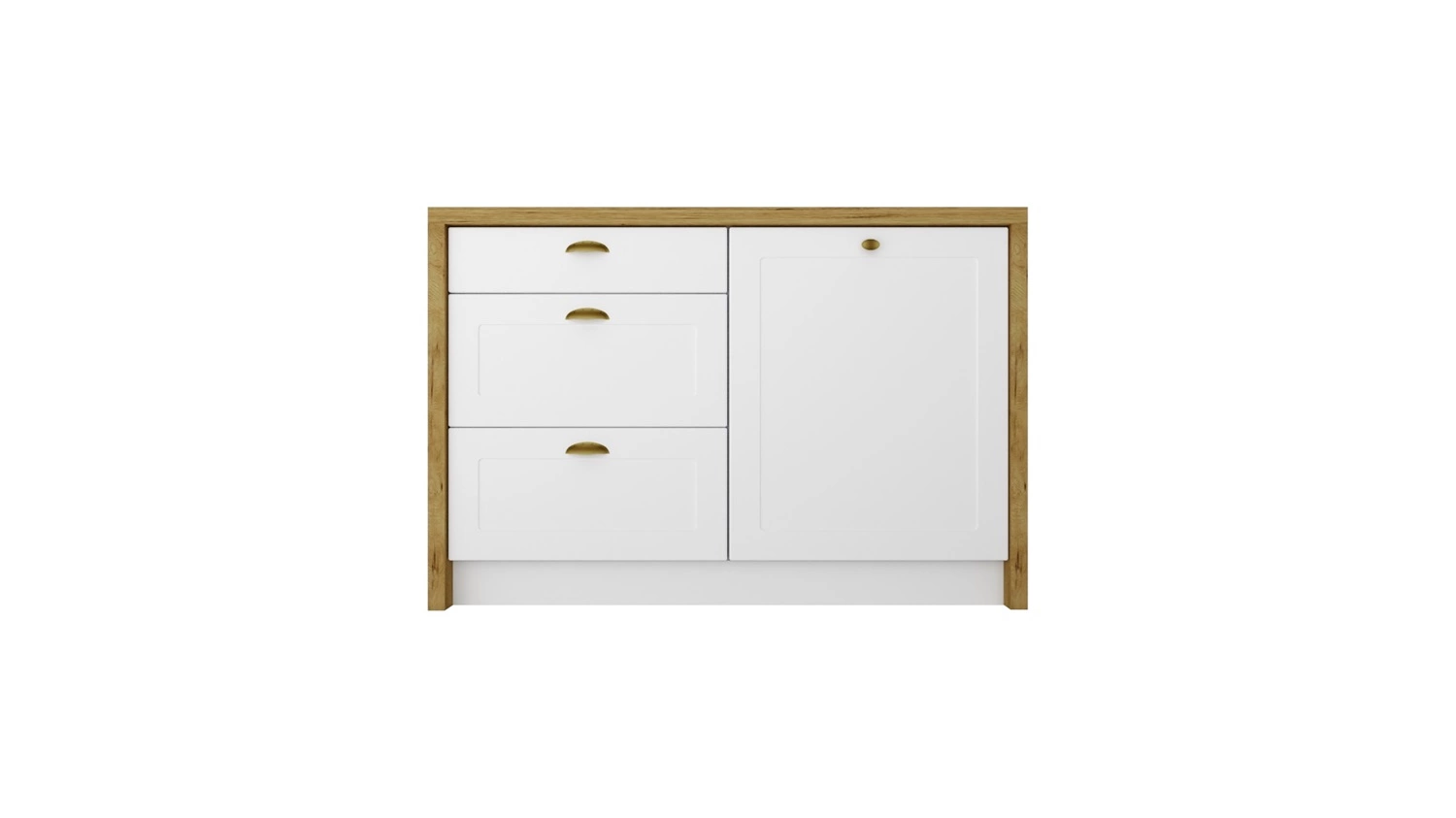 Wyspa kuchenna z szufladami Adele 127 cm dąb artisan / biały funkcjonalny mebel kuchenny odporny na działanie wilgoci metalowe uchwyty