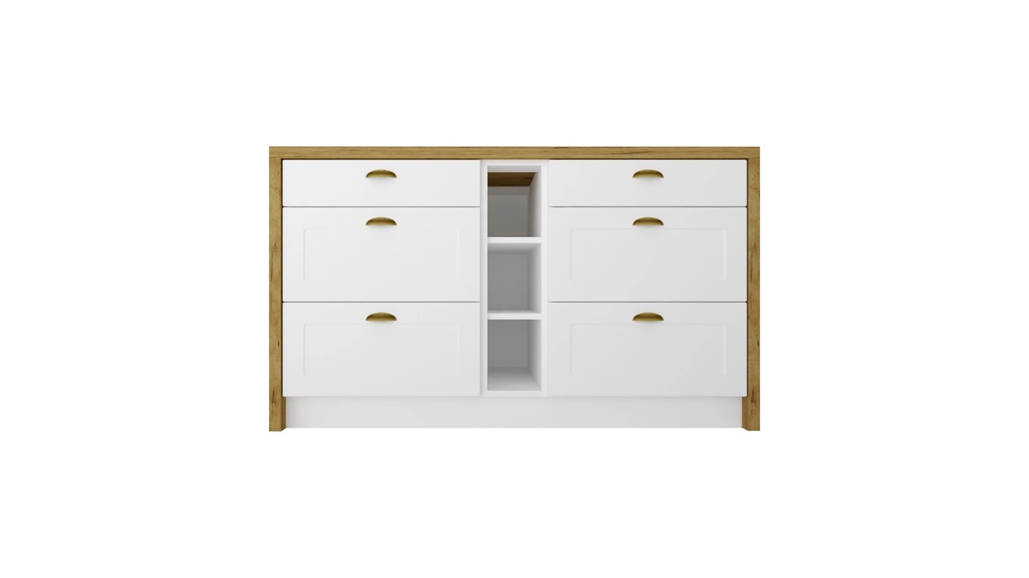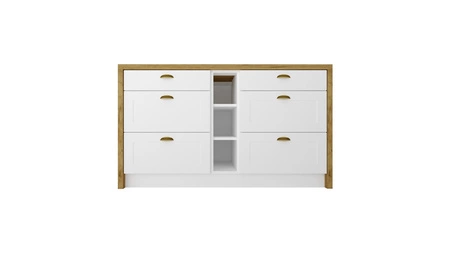 Wyspa kuchenna z szufladami Adele 147 cm dąb artisan / biały komfortowa stylowa wyspa kuchenna z półkami i mosiężnymi uchwytami