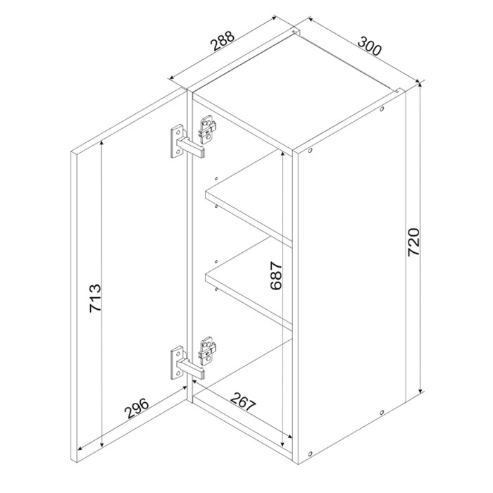 Szafka kuchenna wisząca została wykonana z wysokiej jakości płyty laminowanej o grubości 16 mm. Zaletą tego rodzaju płyty jest wysoka odporność na wpływ zewnętrznych czynników takich jak para wodna, wysoka temperatura, wilgoć, rozlane ciecze. Użyty materiał jest także odporny na przypadkowe uszkodzenia. Obrzeża szafki zabezpieczone okleiną ABS zwiększają wytrzymałość szafki kuchennej. Stylowym dopełnieniem frontów szafki kuchennej są czarne, metalowe uchwyty, które poza swoją podstawową funkcją podkreślają nowoczesny design szafki.