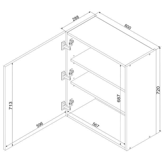 Szafka kuchenna wisząca została wykonana z wysokiej jakości płyty laminowanej o grubości 16 mm. Zaletą tego rodzaju płyty jest wysoka odporność na wpływ zewnętrznych czynników takich jak para wodna, wysoka temperatura, wilgoć, rozlane ciecze. Użyty materiał jest także odporny na przypadkowe uszkodzenia. Obrzeża szafki zabezpieczone okleiną ABS zwiększają wytrzymałość szafki kuchennej. Stylowym dopełnieniem frontów szafki kuchennej są czarne, metalowe uchwyty, które poza swoją podstawową funkcją podkreślają nowoczesny design szafki.