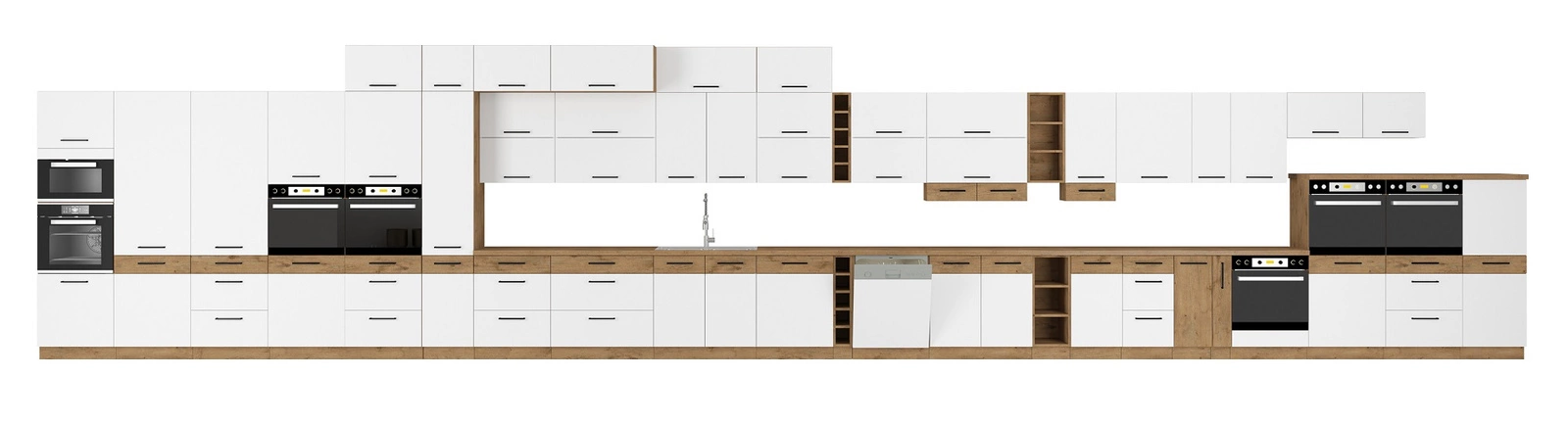 Fronty szafki kuchennej pod zlewozmywak w kolorze białym zostały wykonane z płyty MDF oraz oklejone folią w połysku. Wyrazistym kontrastem frontów szafki kuchennej są wstawki w kolorze dąb lancelot. Obrzeża frontów szafki kuchennej zabezpiecza okleina, która spełnia dwie funkcje. Jest zabezpieczeniem przeciw wilgoci oraz chroni przed przypadkowym uszkodzeniem.