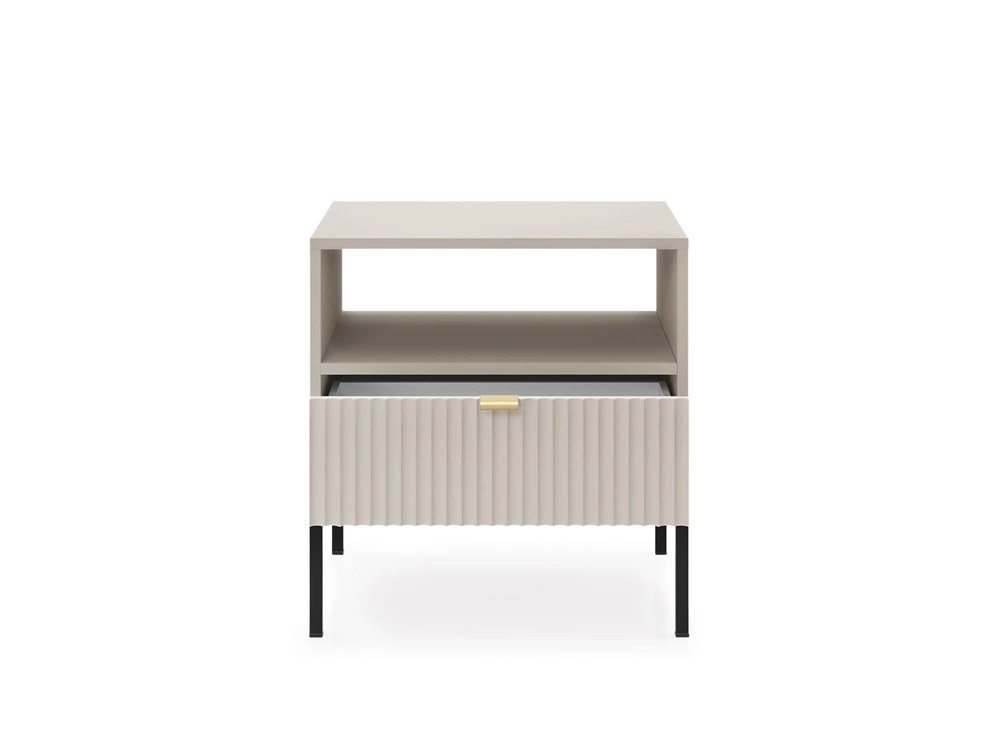 Ryflowany front szuflady wykonany z płyty MDF o grubości 18mm dodaje szczególnego uroku. Stylowym wykończeniem frontu szafki nocnej jest uchwyt krawędziowy w kolorze złotym. Konstrukcję mebla urozmaicono czarnymi metalowymi nogami o wysokości 20 cm.
