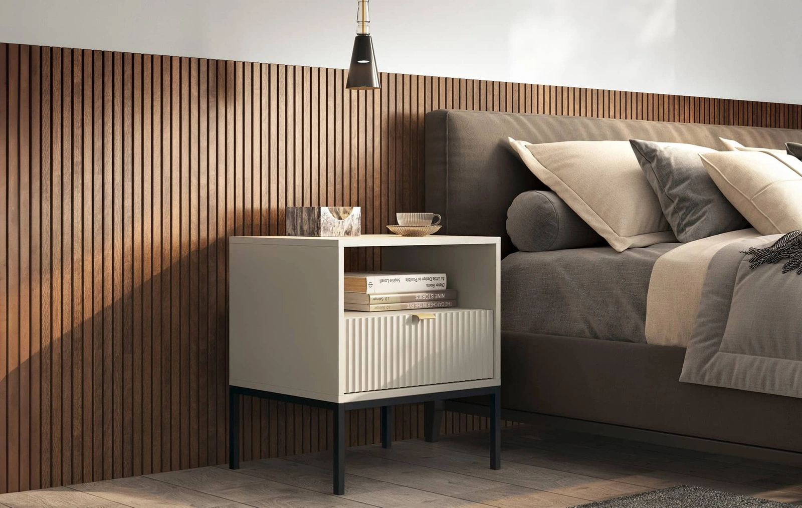 Szafka nocna z szufladą Lovro beżowy gustowny ryflowany dekor idealna szafka do sypialni złoty uchwyt krawędziowy