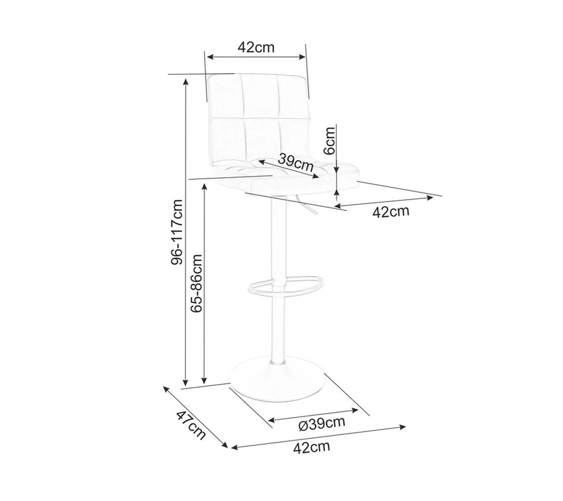 Postawa hokera od spodu ma gumę, która zapewnia doskonałą stabilność oraz zabezpiecza podłogę przed rysowaniem. Hoker posiada siłownik, który pozwala regulować wysokość siedziska, dzięki temu użytkownik może ją dopasować do swoich potrzeb. Dla zwiększenia komfortu hoker posiada wygodne oparcie o wysokości 31 cm, które zapewnią wygodę podczas siedzenia. Dodatkową zaletą hokera jest podpórka pod stopy, co gwarantuje wygodę, nawet przy dłuższym użytkowaniu. Dzięki dekoracyjnemu pikowaniu hoker zyskał niepowtarzalny charakter.