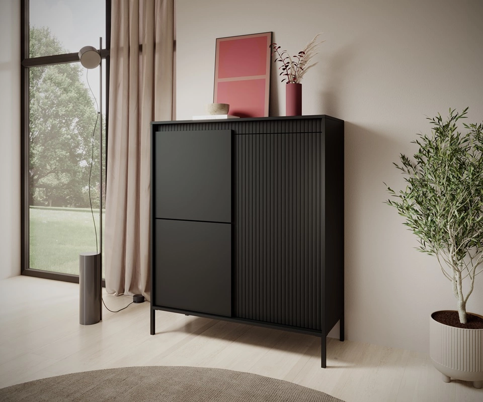 Komoda wysoka Sesti łączy nowoczesność i oryginalność z niezwykle efektownym wykonaniemObecność komody stanie się stylowym wykończeniem pomieszczenia oraz nada mu nowoczesności i niepowtarzalnego klimatu. Ciekawe ryflowania zostały idealnie zrównoważone przez gładkie, nieco wysunięte do przodu fronty co tworzy interesujący efekt trójwymiarowości. Ponadczasowa, klasyczna czerń oraz smukłe, metalowe nogi podkreślają elegancką stylistykę kolekcji Sesti. Unikatowe wzornictwo komody spełni oczekiwania miłośników odważnych, a także wyrafinowanych aranżacji.