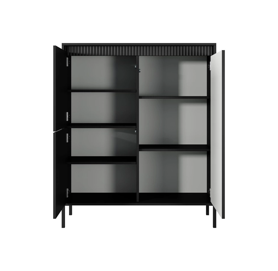 Ryflowane fronty zostały wykonane z płyty MDF o grubości 18mm. Korpus wykonany z wysokiej jakości płyty laminowanej o grubości 16mm, która charakteryzuje się odpornością na wpływ czynników zewnętrznych takich jak obicia, uderzenia i niefortunne zadrapaniaKlasyczna czerń świetnie odnajdzie się w modnych aranżacjach, dzięki czemu komoda Sesti świetnie sprawdzi się w roli komody do salonu o oryginalnym wykończeniu, komody do pokoju dziennego lub komody do sypialni w nowoczesnym stylu. Komoda z powodzeniem odnajdzie się także jako mebel biurowy.