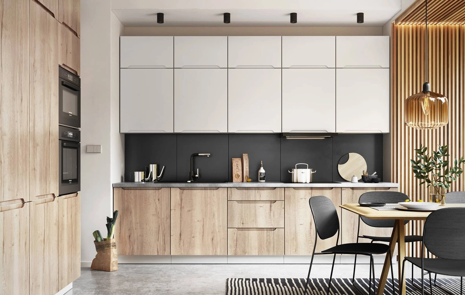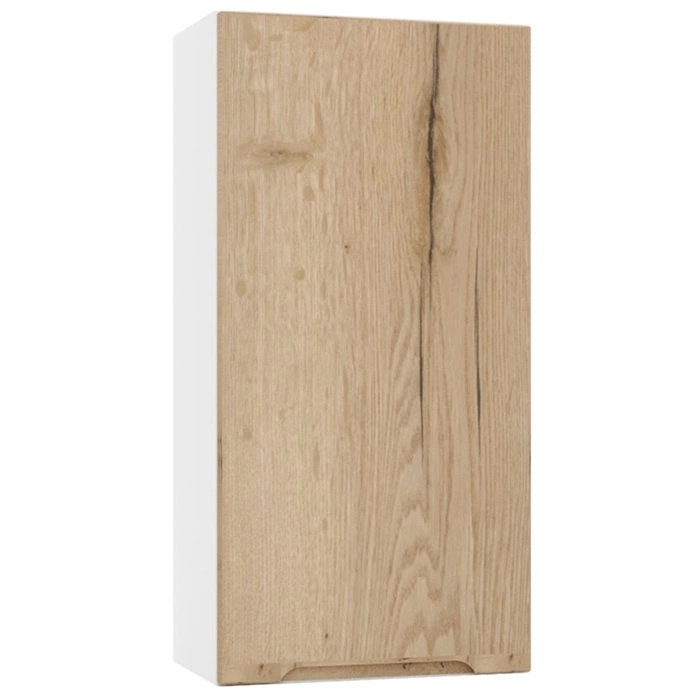 Fronty szafki kuchennej zostały wykonane z płyty MDF o grubości 19 mm. Ponadto fronty zostały pokryte folią PVC w matowym wykończeniu imitującym naturalne drewno z widocznymi pęknięciami. Korpus szafki kuchennej jest wykonany z wysokiej jakości płyty laminowanej o grubości 16 mm. Zaletą tego rodzaju materiałów jest wysoka odporność na wpływ zewnętrznych czynników takich jak para wodna, wysoka temperatura, wilgoć, rozlane ciecze. Użyty materiał jest także odporny na przypadkowe uszkodzenia. Oryginalne frezowania na krawędziach pełnią funkcję uchwytów, a także podkreślają nowoczesny design szafki.