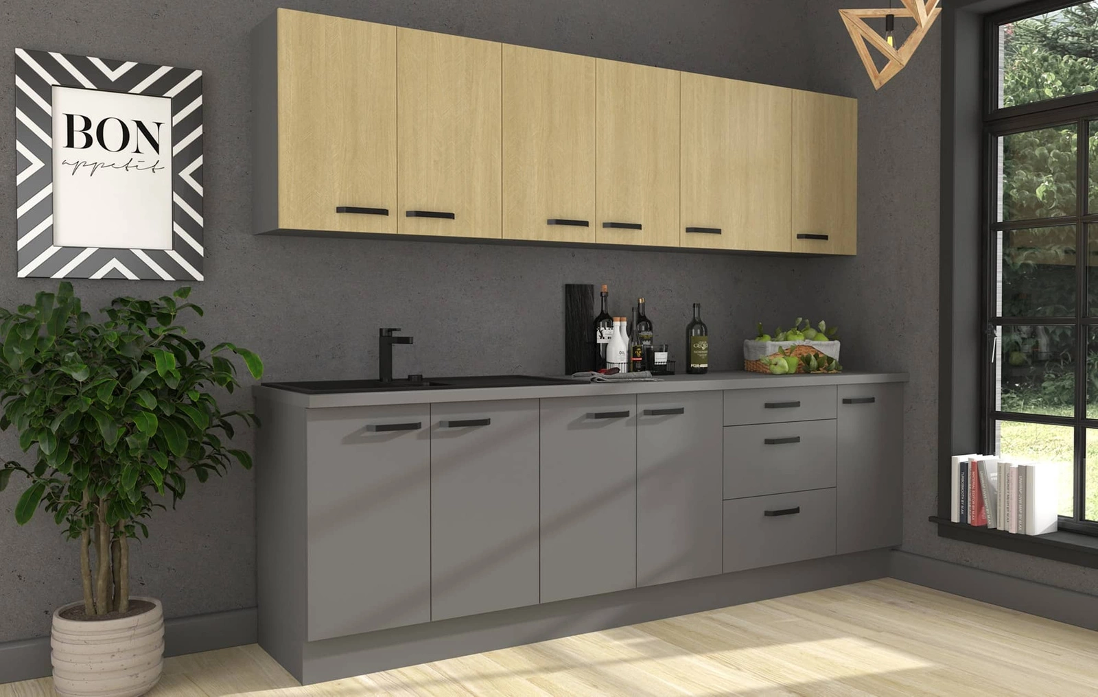 Korpus każdej szafki kuchennej jest wykonany z wysokiej jakości płyty laminowanej o grubości 16 mm, obrzeża są zabezpieczone okleiną ABS. Drzwi mebli kuchennych zostały wykonane z płyty laminowanej. Fronty wykazują wysoką wytrzymałość na działanie wilgoci oraz przypadkowe uszkodzenia. Stylowym wykończeniem frontów szafek kuchennych są metalowe uchwyty w kolorze czarnym.