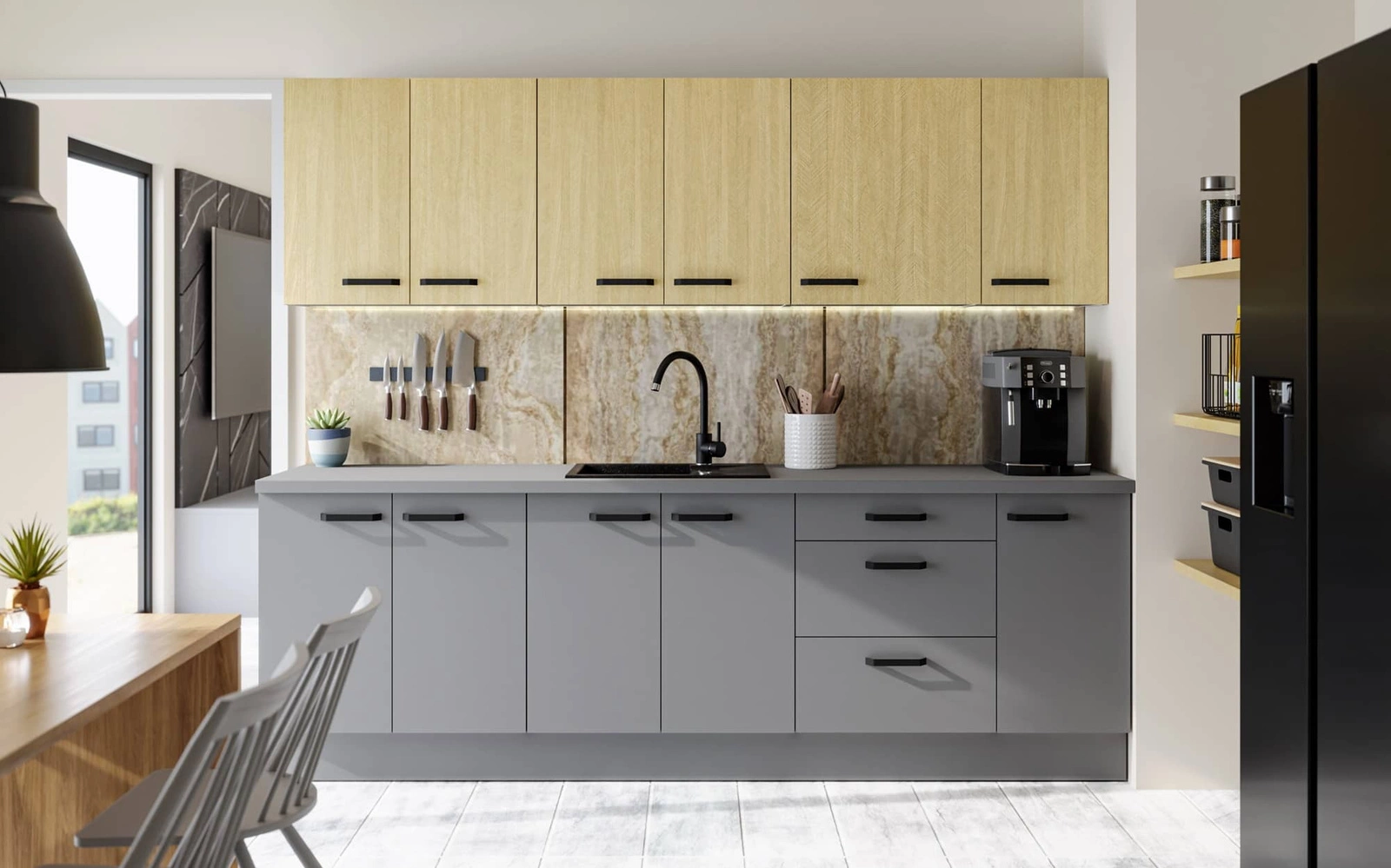 Dzięki uniwersalnemu ustawieniu, meble kuchenne dopasują się do wnętrza każdej kuchni. Antracytowy kolor przełamany frontami z modnym wzorem jodełki nadaje meblom kuchennym szczególnego charakteru. Czarne, metalowe uchwyty podkreślają elegancję szafek kuchennych.
