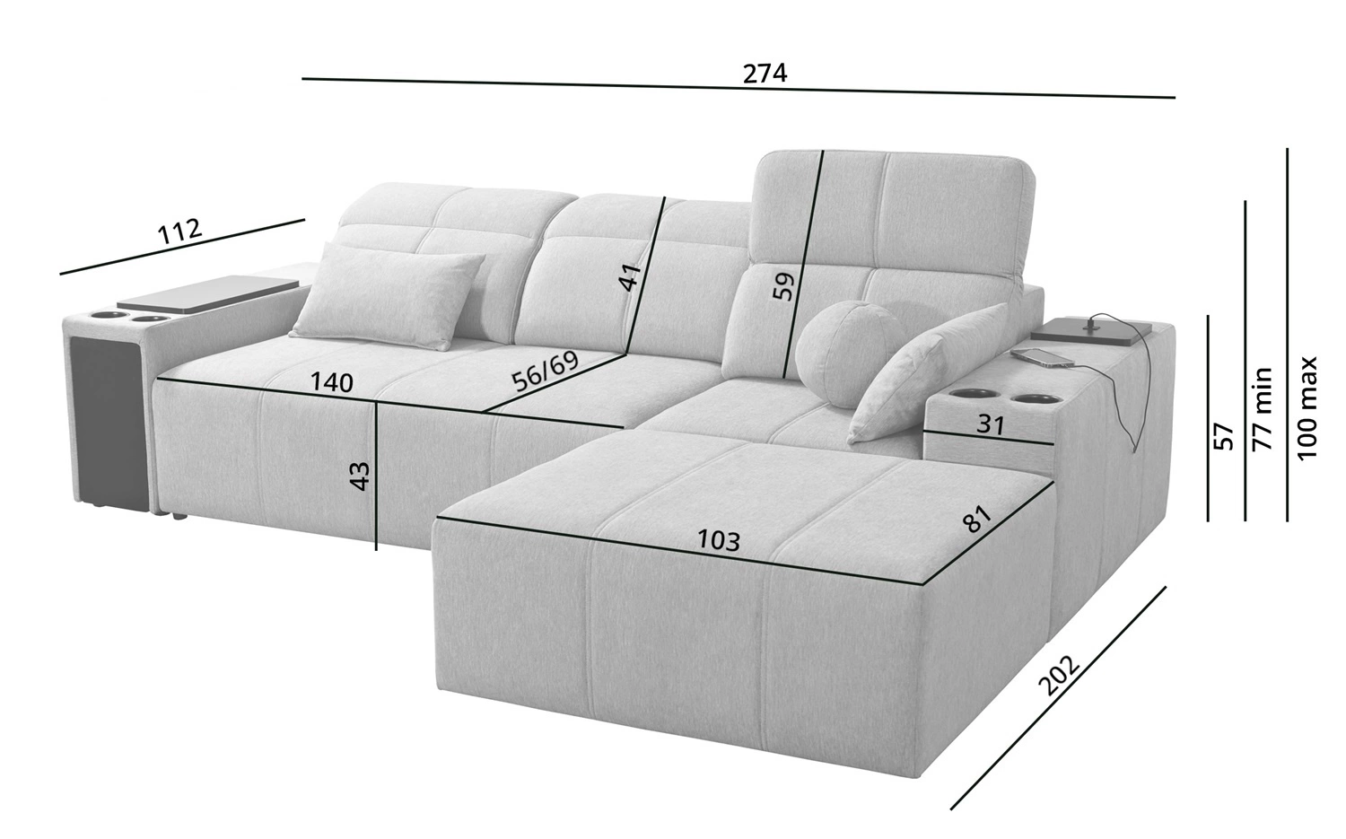 Wymiary mebla pozwolą na zapełnienie przestrzeni w przestronnym salonie lub pokoju dziennym. Szerokość narożnika 274 cm, wysokość maksymalna 100 cm oraz głębokość 202 cm. Powierzchnia spania narożnika wynosi 138x212 cm. Wysokość siedziska mebla to 43 cm a maksymalna wysokość oparcia wynosi 59 cm. Sprężyny faliste oraz pianka poliuretanowa T30 to materiał, z którego wykonane zostało siedzisko narożnika. Oparcie z regulowanymi zagłówkami pozwoli na łatwe dostosowanie kąta nachylenia zagłówków do swoich preferencji oraz daje gwarancję wygodnego wypoczynku po długim dniu, które docenisz Ty, Twoi bliscy a także goście, którzy zasiądą na tym wyjątkowym narożniku.