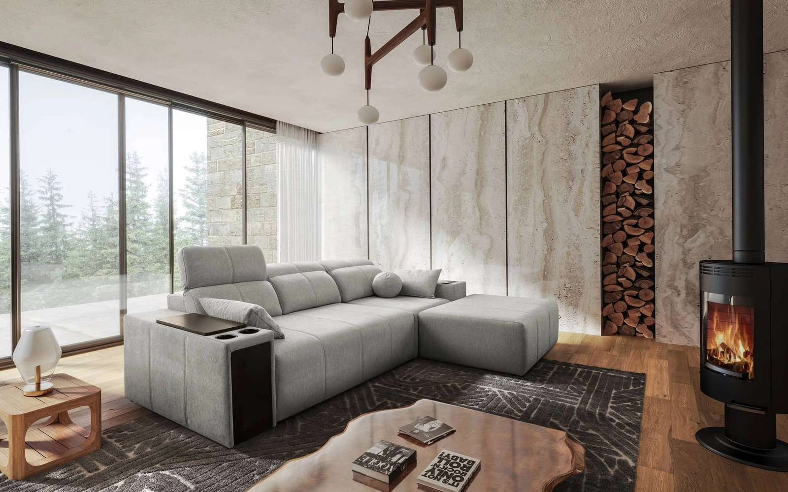 Dodatki tego mebla, które docenią wszyscy użytkownicy to regulowane oparcia pozwalające dopasować głębokość siedziska, szuflada i otwierany barek w boczku narożnika, gniazdo ładowania USB, uchwyty na kubki oraz pojemnik na pościel.