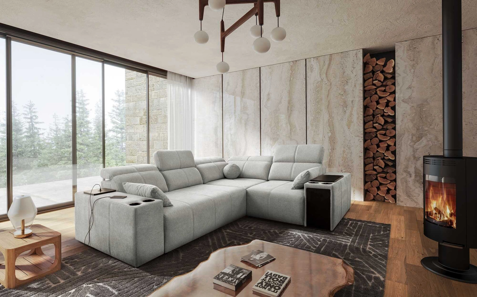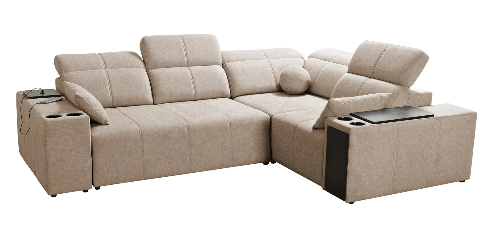 Dodatki tego mebla, które docenią wszyscy użytkownicy to regulowane oparcia pozwalające dopasować głębokość siedziska, szuflada i otwierany barek w boczku narożnika, gniazdo ładowania USB, uchwyty na kubki oraz pojemnik na pościel.