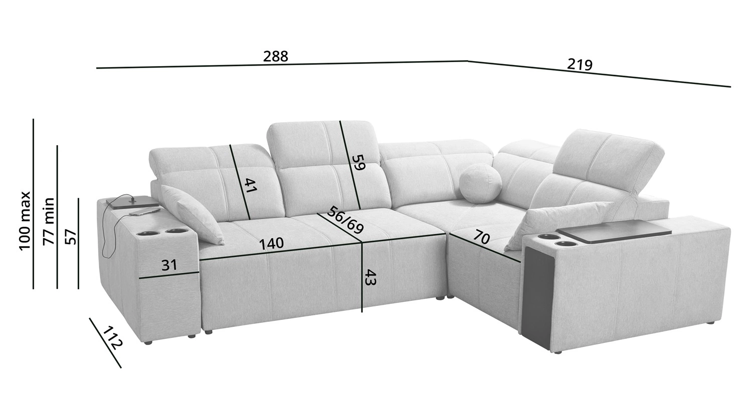 Wymiary mebla pozwolą na zapełnienie przestrzeni w przestronnym salonie lub pokoju dziennym. Szerokość narożnika 288 cm, wysokość maksymalna 100 cm oraz głębokość 219 cm. Powierzchnia spania narożnika wynosi 138x212 cm. Wysokość siedziska mebla to 43 cm a maksymalna wysokość oparcia wynosi 59 cm. Sprężyny faliste oraz pianka poliuretanowa T30 to materiał, z którego wykonane zostało siedzisko narożnika. Oparcie z regulowanymi zagłówkami pozwoli na łatwe dostosowanie kąta nachylenia zagłówków do swoich preferencji oraz daje gwarancję wygodnego wypoczynku po długim dniu, które docenisz Ty, Twoi bliscy a także goście, którzy zasiądą na tym wyjątkowym narożniku.