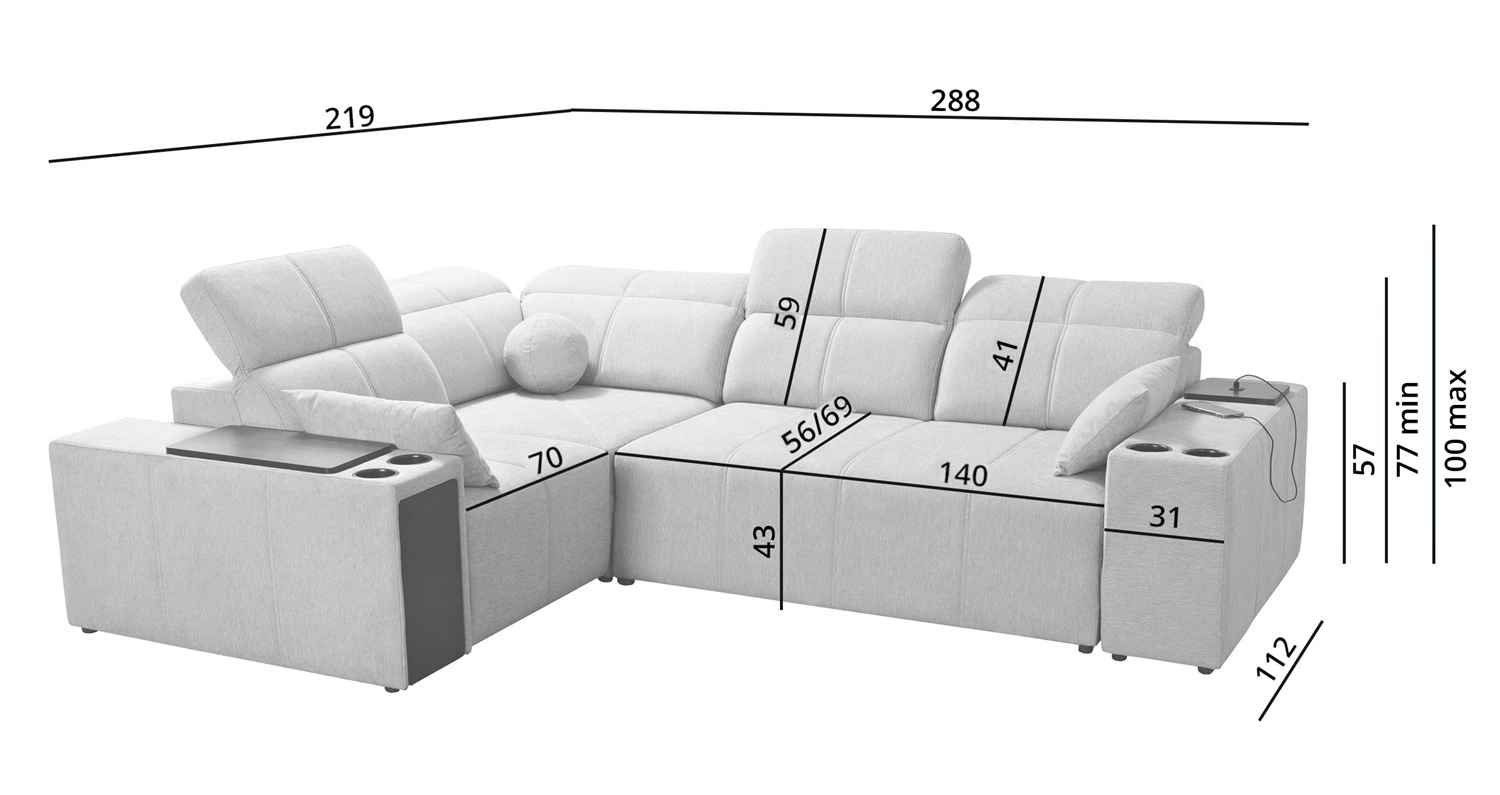 Dodatki tego mebla, które docenią wszyscy użytkownicy to regulowane oparcia pozwalające dopasować głębokość siedziska, szuflada i otwierany barek w boczku narożnika, gniazdo ładowania USB, uchwyty na kubki oraz pojemnik na pościel.