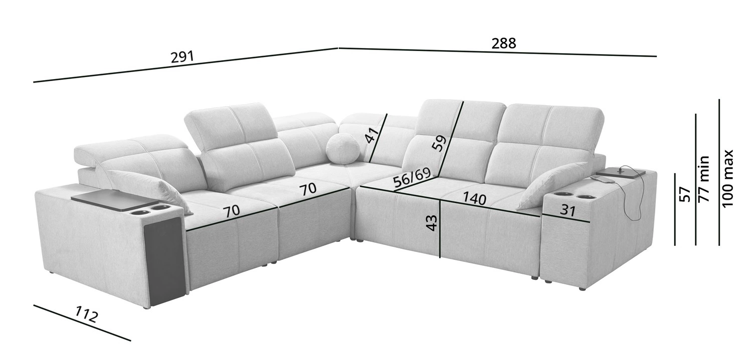 Wymiary mebla pozwolą na zapełnienie przestrzeni w przestronnym salonie lub pokoju dziennym. Szerokość narożnika 288 cm, wysokość maksymalna 100 cm oraz głębokość 291 cm. Powierzchnia spania narożnika wynosi 138x212 cm. Wysokość siedziska mebla to 43 cm a maksymalna wysokość oparcia wynosi 59 cm. Sprężyny faliste oraz pianka poliuretanowa T30 to materiał, z którego wykonane zostało siedzisko narożnika. Oparcie z regulowanymi zagłówkami pozwoli na łatwe dostosowanie kąta nachylenia zagłówków do swoich preferencji oraz daje gwarancję wygodnego wypoczynku po długim dniu, które docenisz Ty, Twoi bliscy a także goście, którzy zasiądą na tym wyjątkowym narożniku.