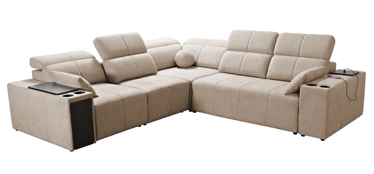 Dodatki tego mebla, które docenią wszyscy użytkownicy to regulowane oparcia pozwalające dopasować głębokość siedziska, szuflada i otwierany barek w boczku narożnika, gniazdo ładowania USB, uchwyty na kubki oraz dwa pojemniki na pościel.