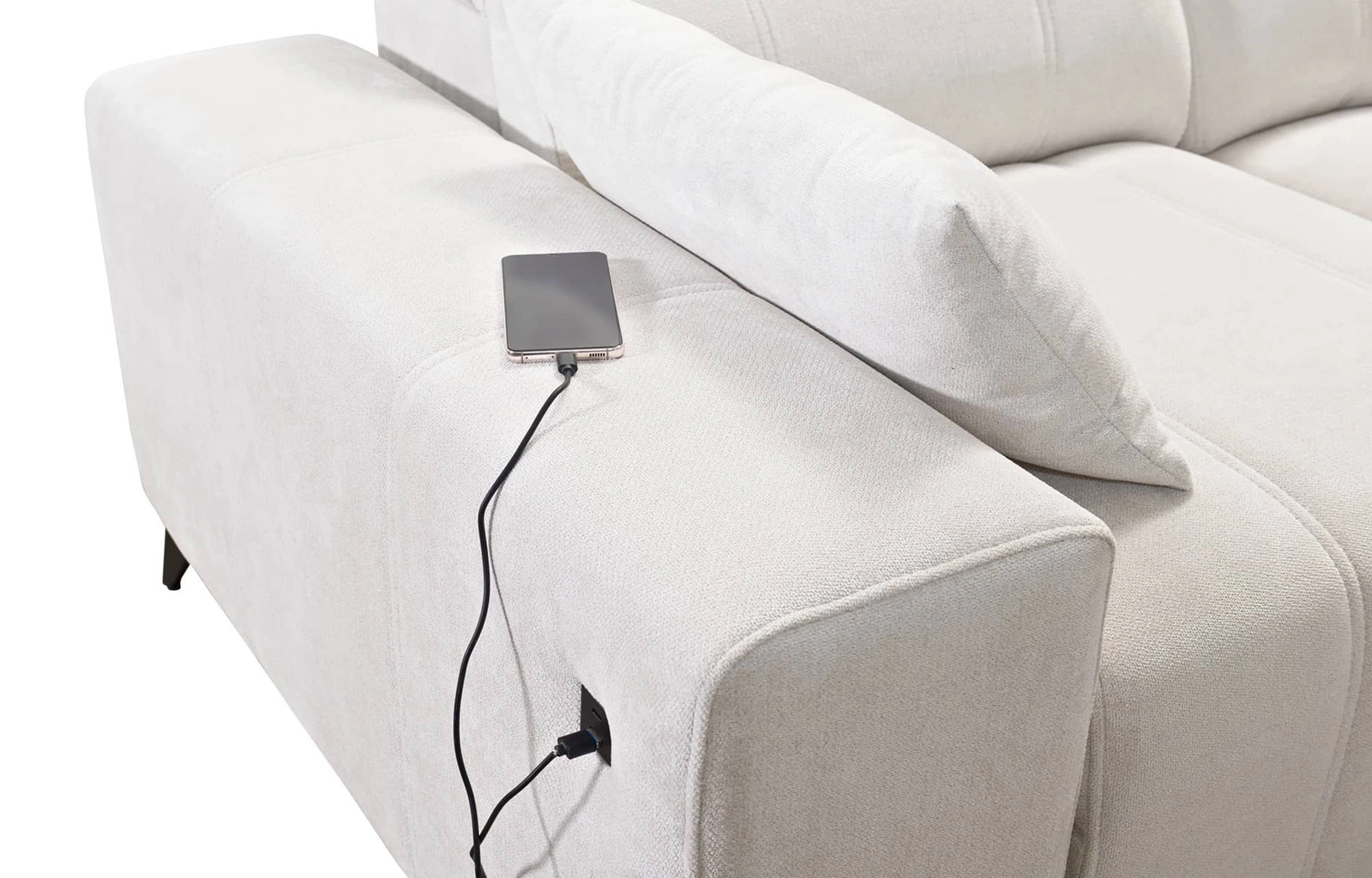 Dodatki tego mebla, które docenią wszyscy użytkownicy to pojemnik na pościel, funkcja spania oraz gniazdo ładowania USB w boczku narożnika.