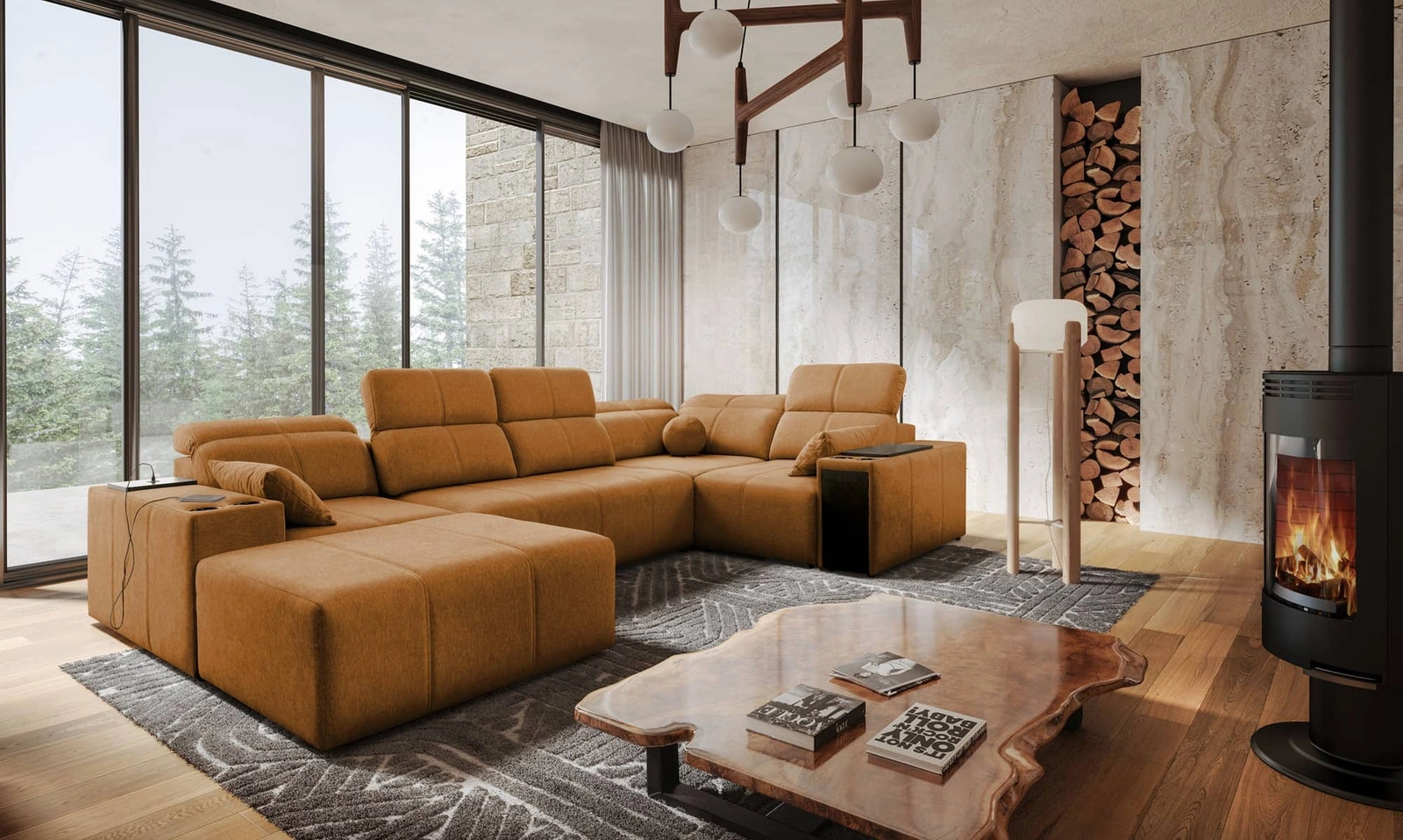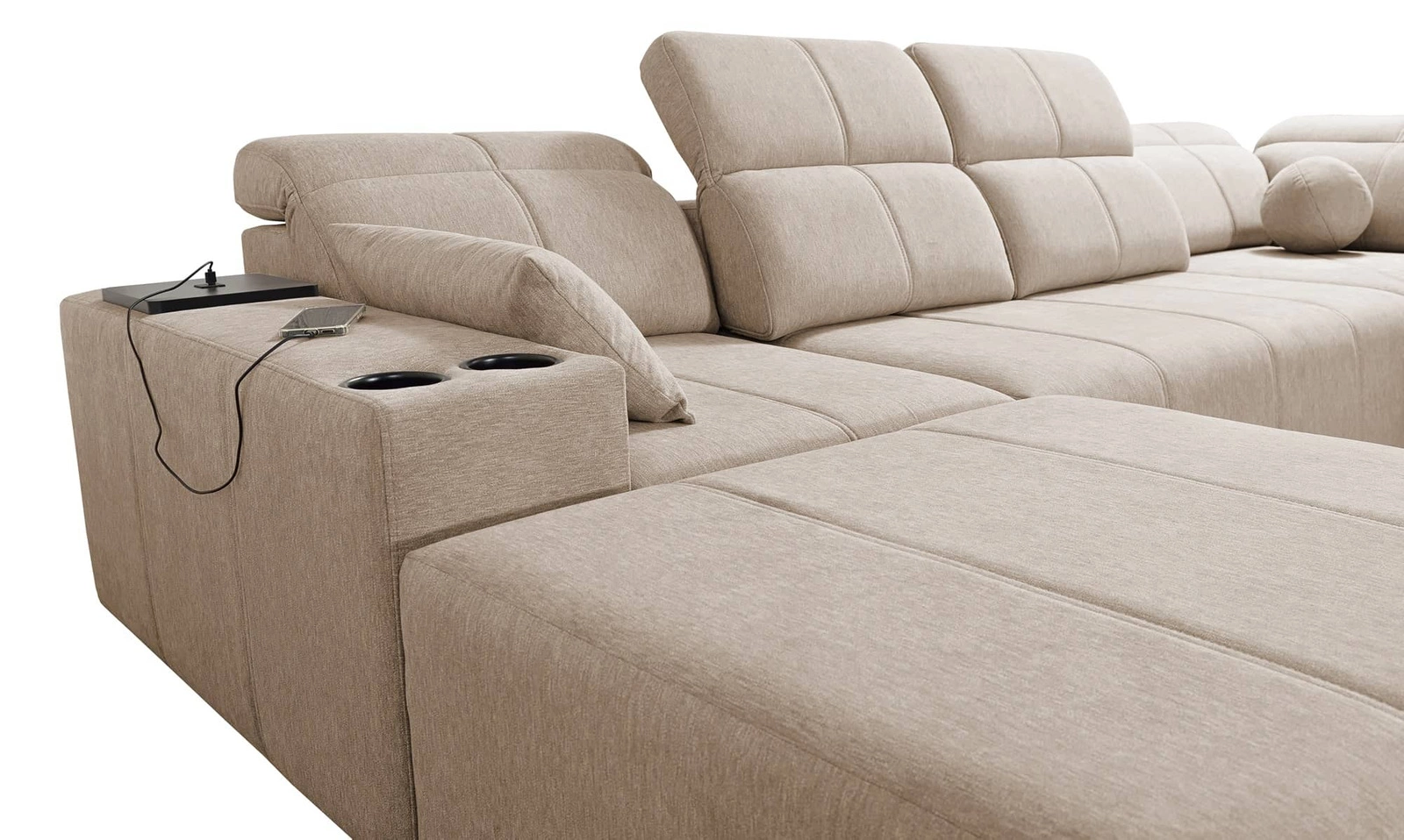 Dodatki tego mebla, które docenią wszyscy użytkownicy to regulowane oparcia pozwalające dopasować głębokość siedziska, szuflada i otwierany barek w boczku narożnika, gniazdo ładowania USB, uchwyty na kubki oraz dwa pojemniki na pościel.