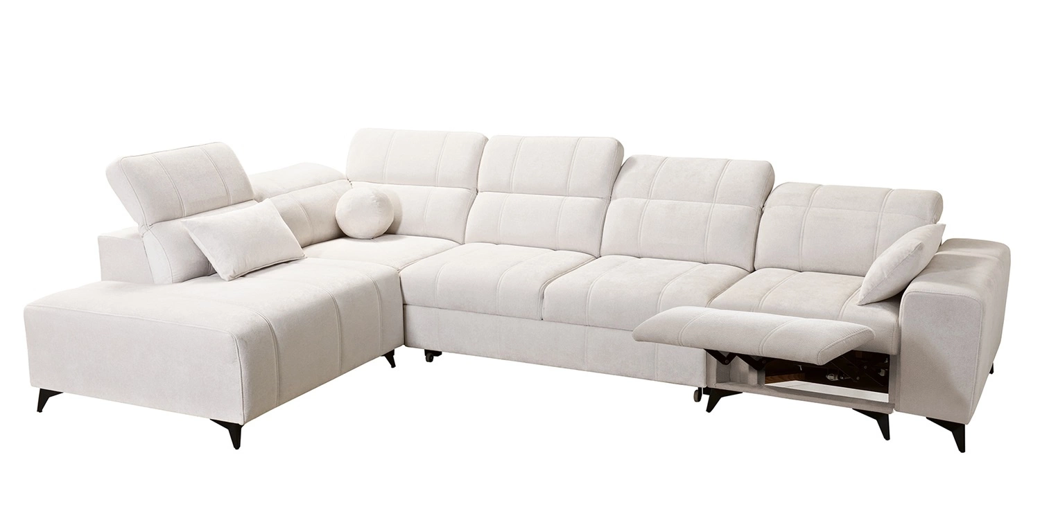 Dodatki tego mebla, które docenią wszyscy użytkownicy to wysuwany podnóżek, pojemnik na pościel, funkcja spania oraz gniazdo ładowania USB w boczku narożnika.