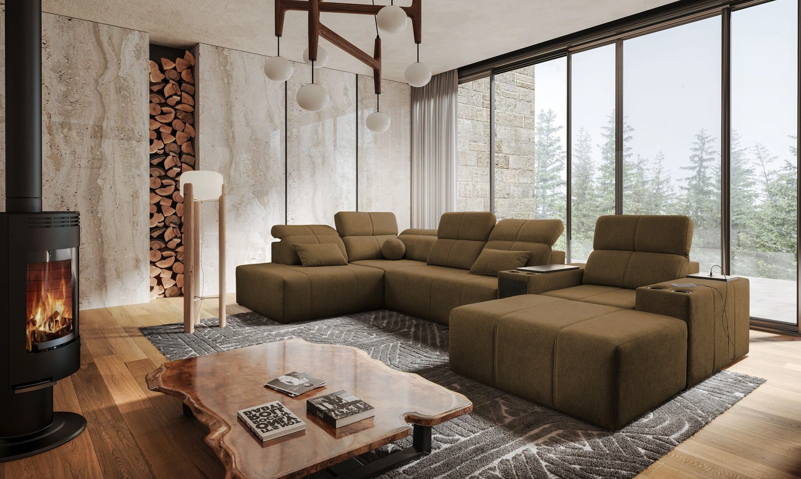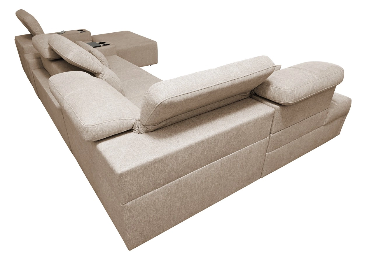 Dodatki tego mebla, które docenią wszyscy użytkownicy to szuflada i otwierany barek w boczku narożnika, gniazdo ładowania USB, uchwyty na kubki, regulowane oparcia pozwalające dopasować głębokość siedziska oraz dwa pojemniki na pościel.
