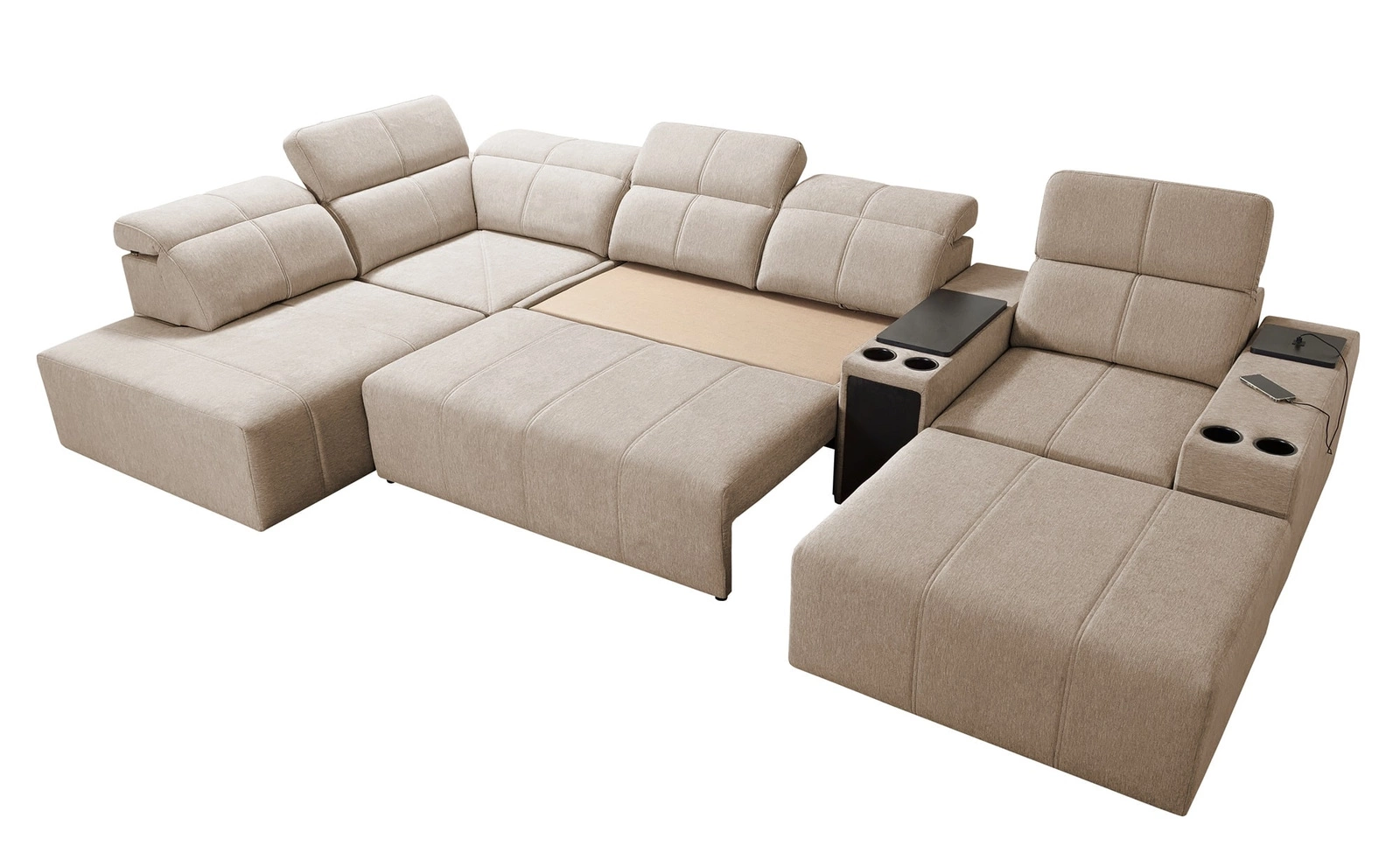 Dodatki tego mebla, które docenią wszyscy użytkownicy to szuflada i otwierany barek w boczku narożnika, gniazdo ładowania USB, uchwyty na kubki, regulowane oparcia pozwalające dopasować głębokość siedziska oraz dwa pojemniki na pościel.