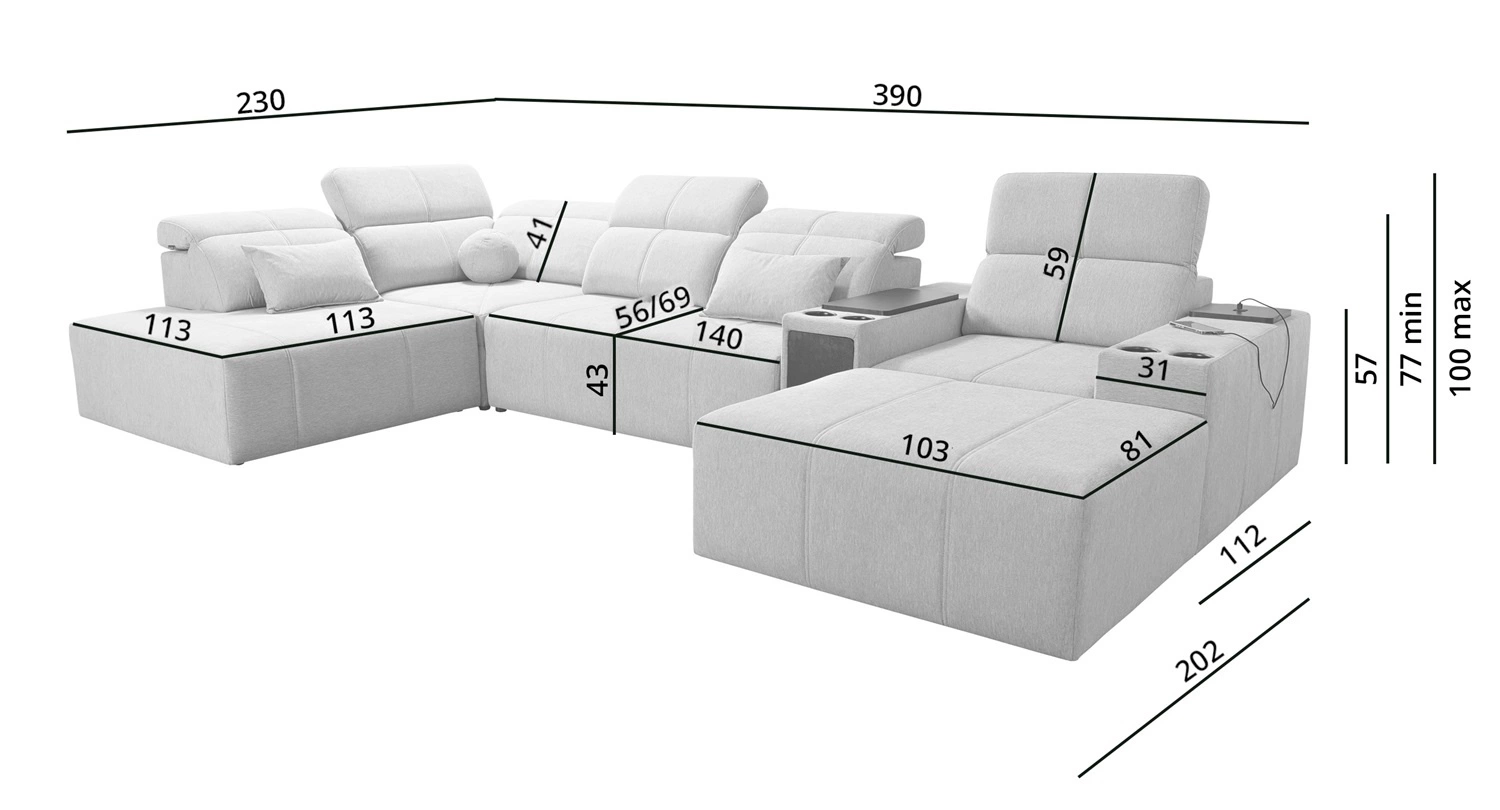 Wymiary mebla pozwolą na zapełnienie przestrzeni w przestronnym salonie lub pokoju dziennym. Szerokość narożnika 390 cm, wysokość maksymalna 100 cm oraz głębokość 230 cm. Powierzchnia spania narożnika wynosi 138x212 cm. Wysokość siedziska mebla to 43 cm a maksymalna wysokość oparcia wynosi 59 cm. Sprężyny faliste oraz pianka poliuretanowa T30 to materiał, z którego wykonane zostało siedzisko narożnika. Oparcie z regulowanymi zagłówkami pozwoli na łatwe dostosowanie kąta nachylenia zagłówków do swoich preferencji oraz daje gwarancję wygodnego wypoczynku po długim dniu, które docenisz Ty, Twoi bliscy a także goście, którzy zasiądą na tym wyjątkowym narożniku.