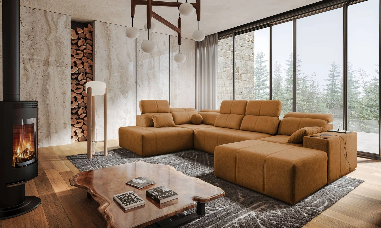 Narożnik z funkcją spania Tesalia VI miodowy prawostronny nowoczesny i komfortowy narożnik z funkcją przesuwanego oparcia