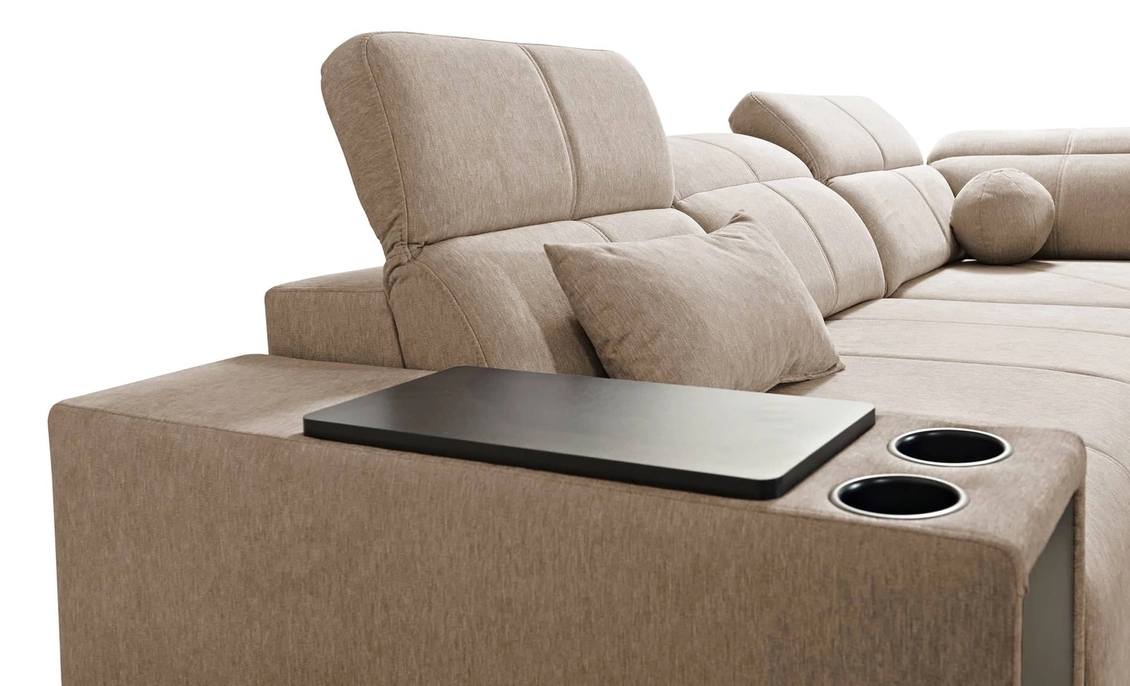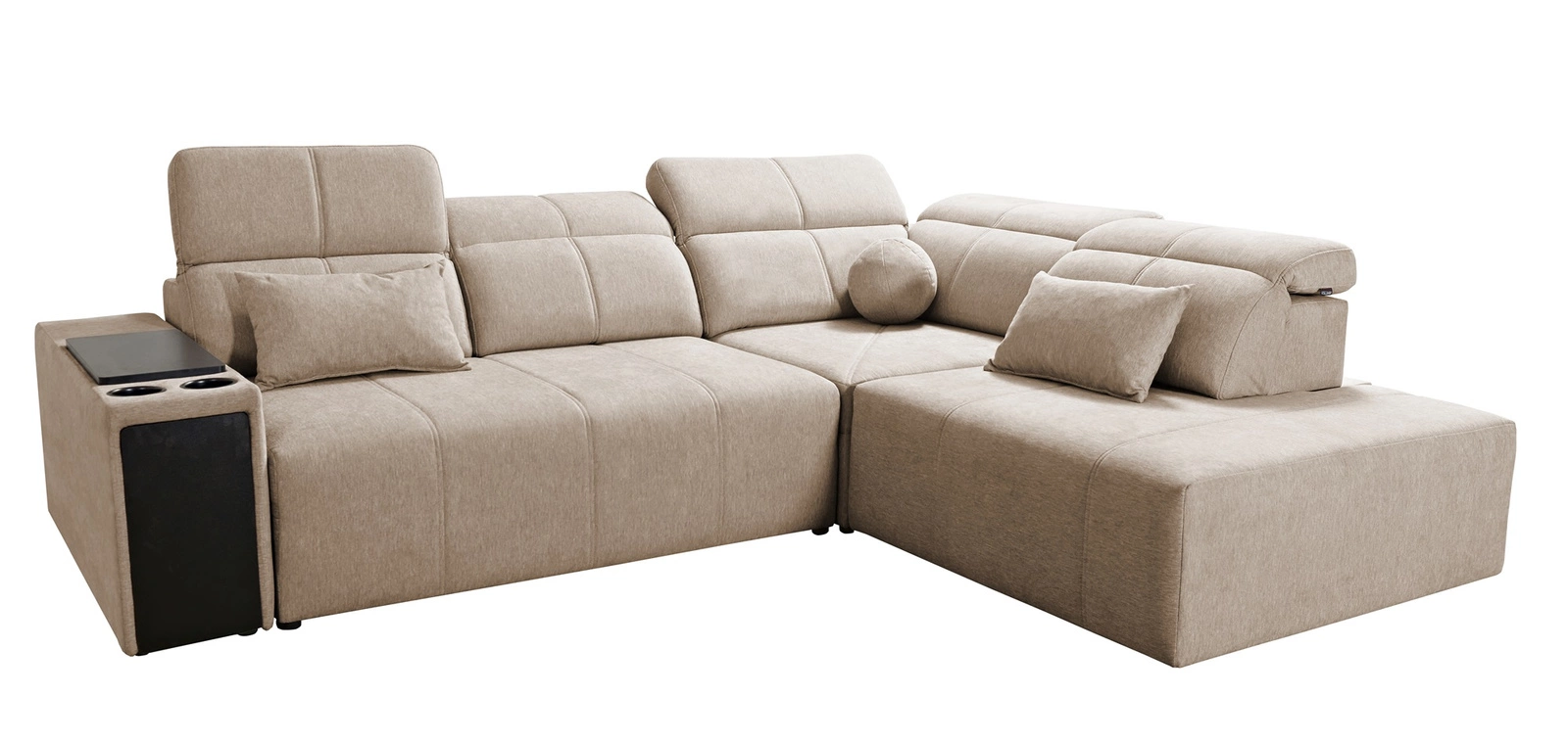 Dodatki tego mebla, które docenią wszyscy użytkownicy to regulowane oparcia pozwalające dopasować głębokość siedziska, szuflada i otwierany barek w boczku narożnika, gniazdo ładowania USB, uchwyty na kubki oraz pojemnik na pościel.