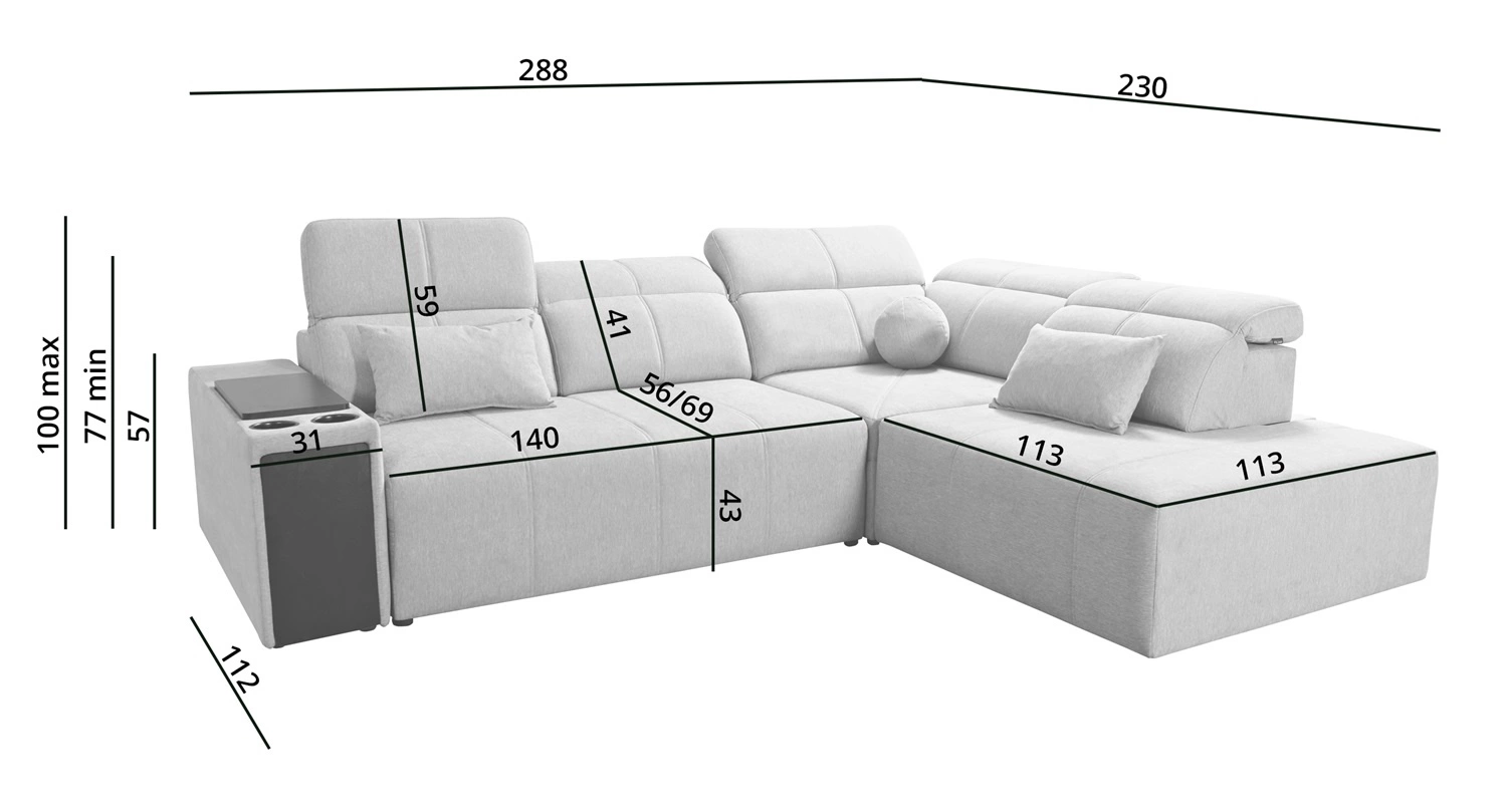 Wymiary mebla pozwolą na zapełnienie przestrzeni w przestronnym salonie lub pokoju dziennym. Szerokość narożnika 288 cm, wysokość maksymalna 100 cm oraz głębokość 230 cm. Powierzchnia spania narożnika wynosi 138x212 cm. Wysokość siedziska mebla to 43 cm a maksymalna wysokość oparcia wynosi 59 cm. Sprężyny faliste oraz pianka poliuretanowa T30 to materiał, z którego wykonane zostało siedzisko narożnika. Oparcie z regulowanymi zagłówkami pozwoli na łatwe dostosowanie kąta nachylenia zagłówków do swoich preferencji oraz daje gwarancję wygodnego wypoczynku po długim dniu, które docenisz Ty, Twoi bliscy a także goście, którzy zasiądą na tym wyjątkowym narożniku.