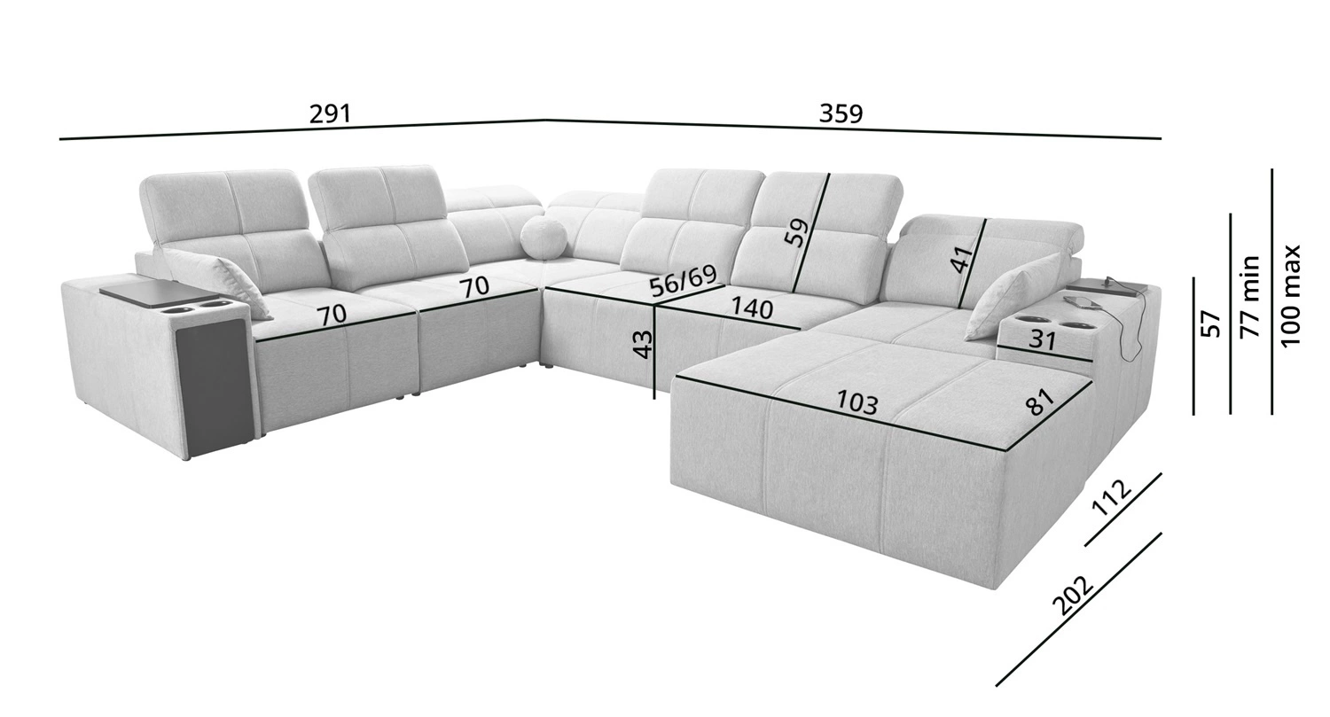 Wymiary mebla pozwolą na zapełnienie przestrzeni w przestronnym salonie lub pokoju dziennym. Szerokość narożnika 359 cm, wysokość maksymalna 100 cm oraz głębokość 291 cm. Powierzchnia spania narożnika wynosi 138x284 cm. Wysokość siedziska mebla to 43 cm a maksymalna wysokość oparcia wynosi 59 cm. Sprężyny faliste oraz pianka poliuretanowa T30 to materiał, z którego wykonane zostało siedzisko narożnika. Oparcie z regulowanymi zagłówkami pozwoli na łatwe dostosowanie kąta nachylenia zagłówków do swoich preferencji oraz daje gwarancję wygodnego wypoczynku po długim dniu, które docenisz Ty, Twoi bliscy a także goście, którzy zasiądą na tym wyjątkowym narożniku.
