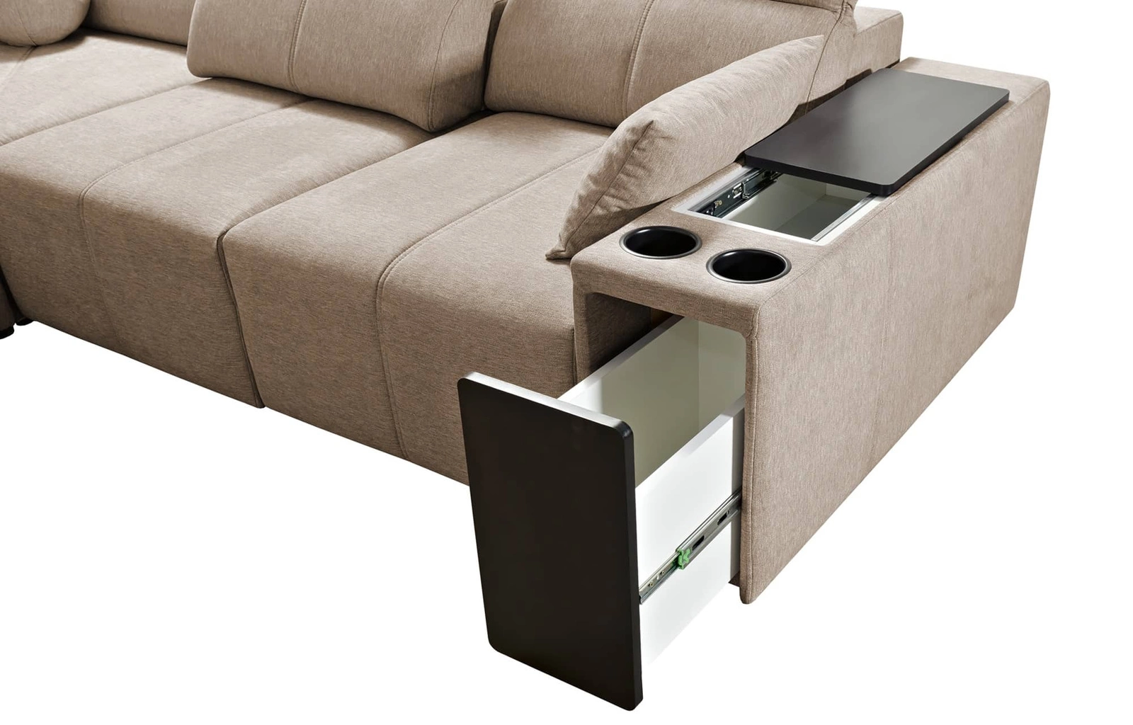 Dodatki tego mebla, które docenią wszyscy użytkownicy to regulowane oparcia pozwalające dopasować głębokość siedziska, szuflada i otwierany barek w boczku narożnika, gniazdo ładowania USB, uchwyty na kubki oraz trzy pojemniki na pościel.