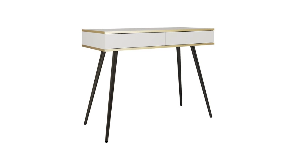 Konsola Luxury biała z szufladami stylowa i elegancka toaletka wsparta na wysokich czarnych nogach korpus zwieńczony złotą listwą