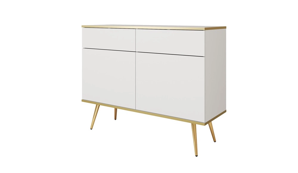 Komoda z szufladami Luxury 107 cm biała nowoczesny design komody do salonu korpus zwieńczony złotą listwą wysokie metalowe nogi