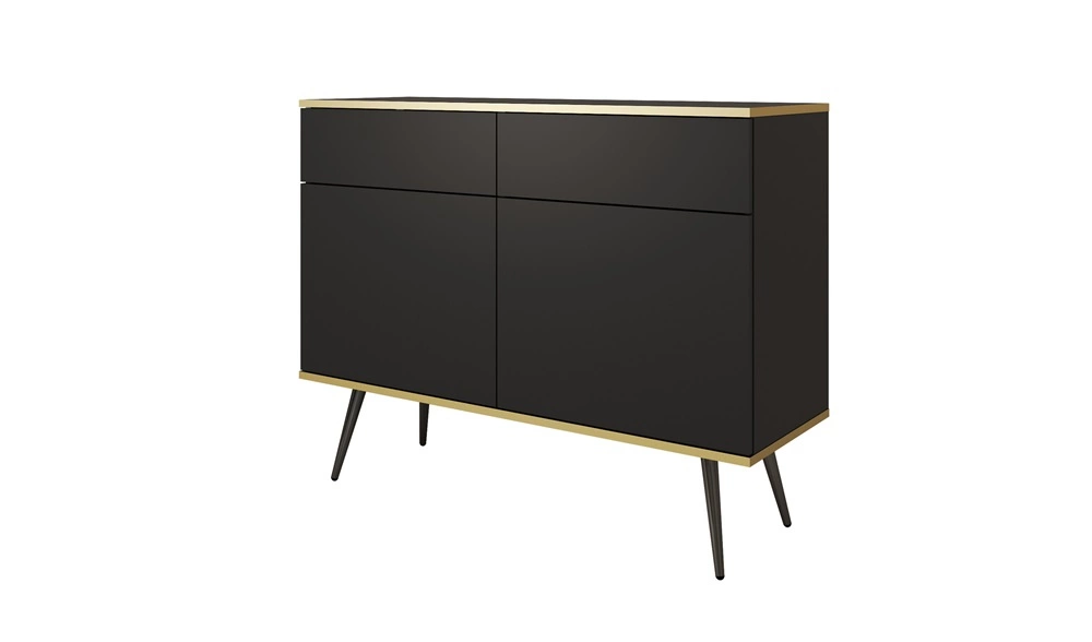 - Komoda z szufladami Luxury to modny mebel, który stanie się stylowym wykończeniem salonu oraz nada mu szczególnego charakteru. Złota listwa okalająca korpus sprawia, że komoda prezentuje się bardzo szykownie. Wysokie, czarne nogi nadają funkcjonalności.