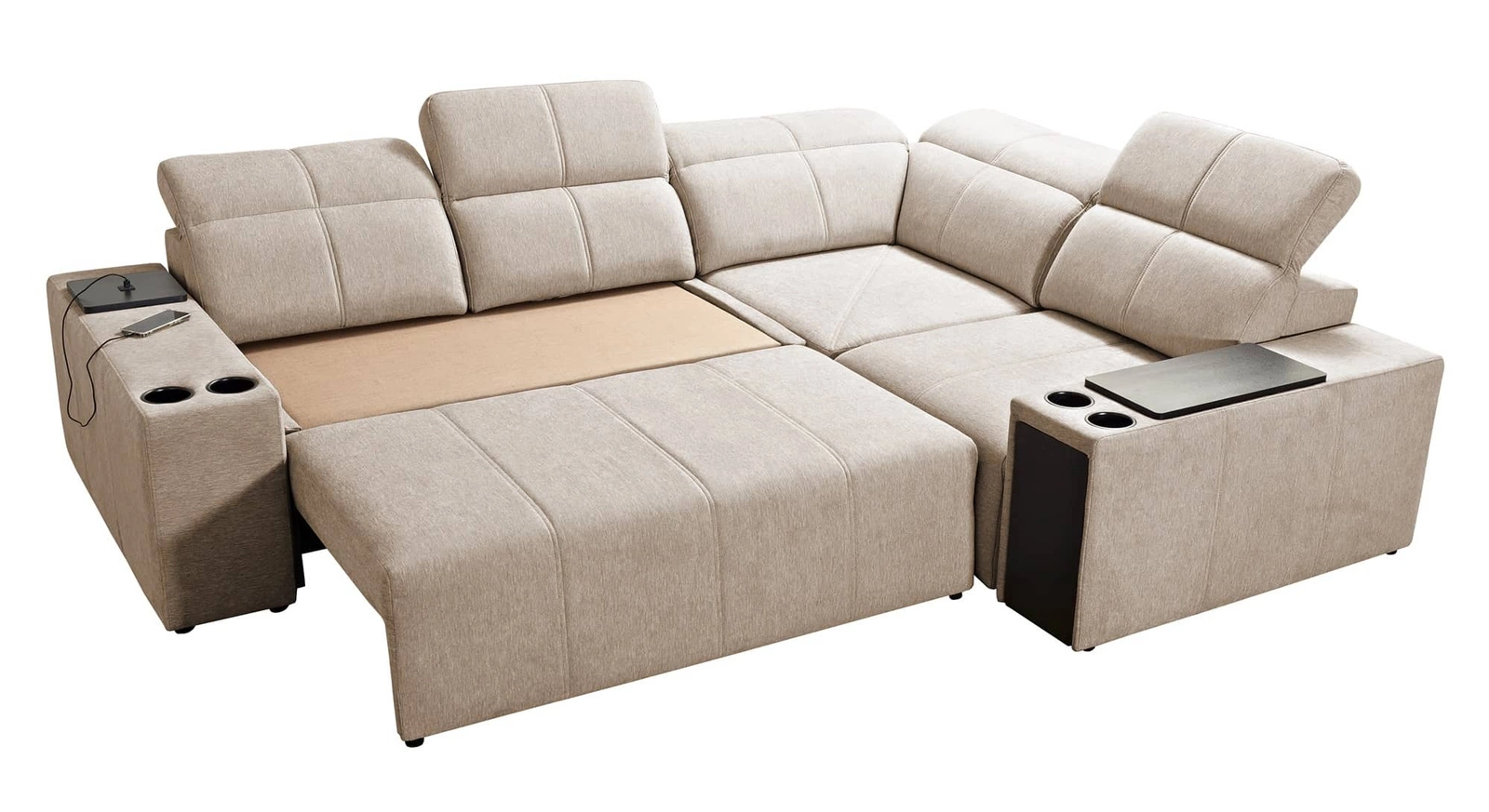 Dodatki tego mebla, które docenią wszyscy użytkownicy to regulowane oparcia pozwalające dopasować głębokość siedziska, wysuwany podnóżek, szuflada i otwierany barek w boczku narożnika, gniazdo ładowania USB oraz uchwyty na kubki.