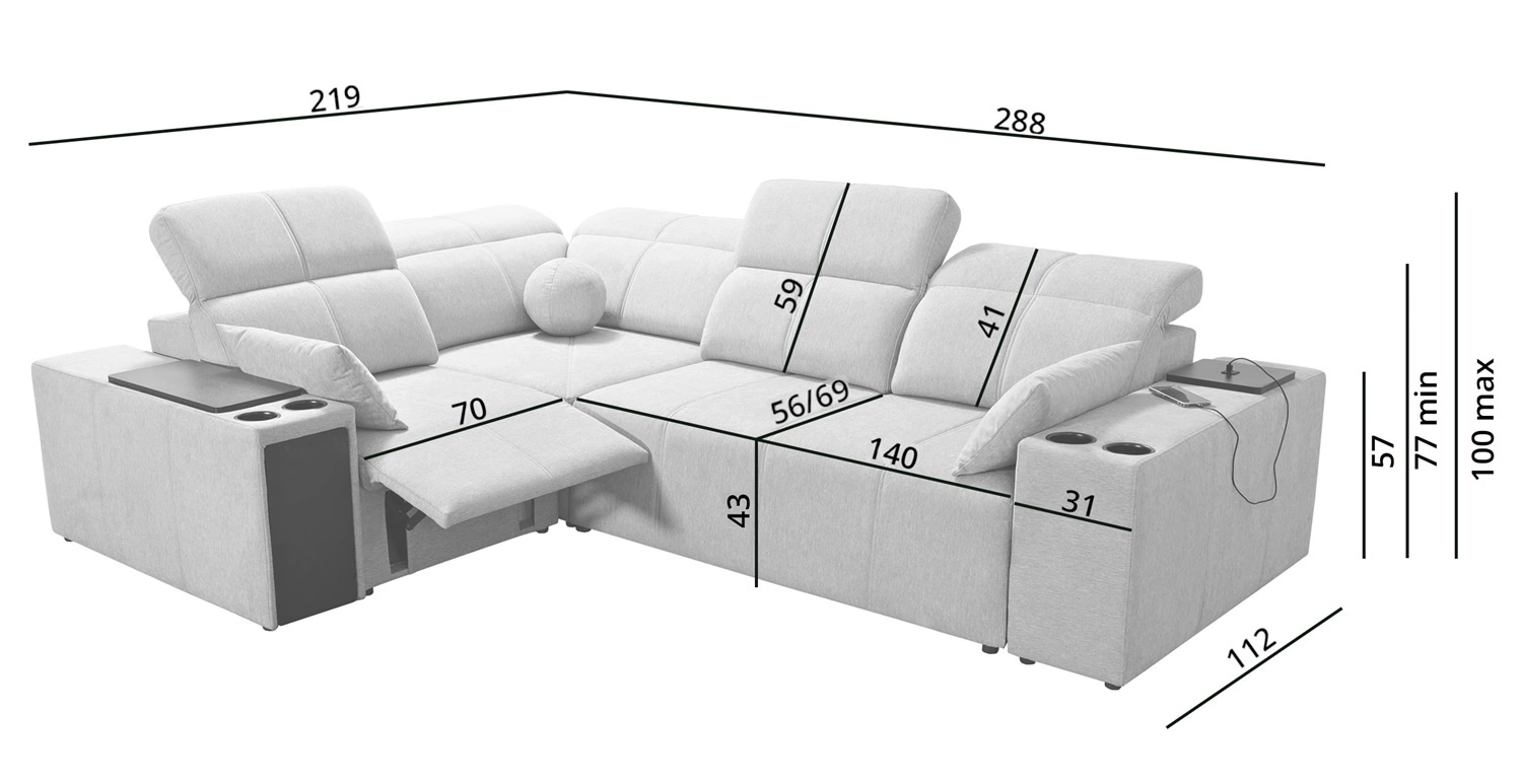 Wymiary mebla pozwolą na zapełnienie przestrzeni w przestronnym salonie lub pokoju dziennym. Szerokość narożnika 288 cm, wysokość maksymalna 100 cm oraz głębokość 219 cm. Powierzchnia spania narożnika wynosi 138x212 cm. Wysokość siedziska mebla to 43 cm a maksymalna wysokość oparcia wynosi 59 cm. Sprężyny faliste oraz pianka poliuretanowa T30 to materiał, z którego wykonane zostało siedzisko narożnika. Oparcie z regulowanymi zagłówkami pozwoli na łatwe dostosowanie kąta nachylenia zagłówków do swoich preferencji oraz daje gwarancję wygodnego wypoczynku po długim dniu, które docenisz Ty, Twoi bliscy a także goście, którzy zasiądą na tym wyjątkowym narożniku.