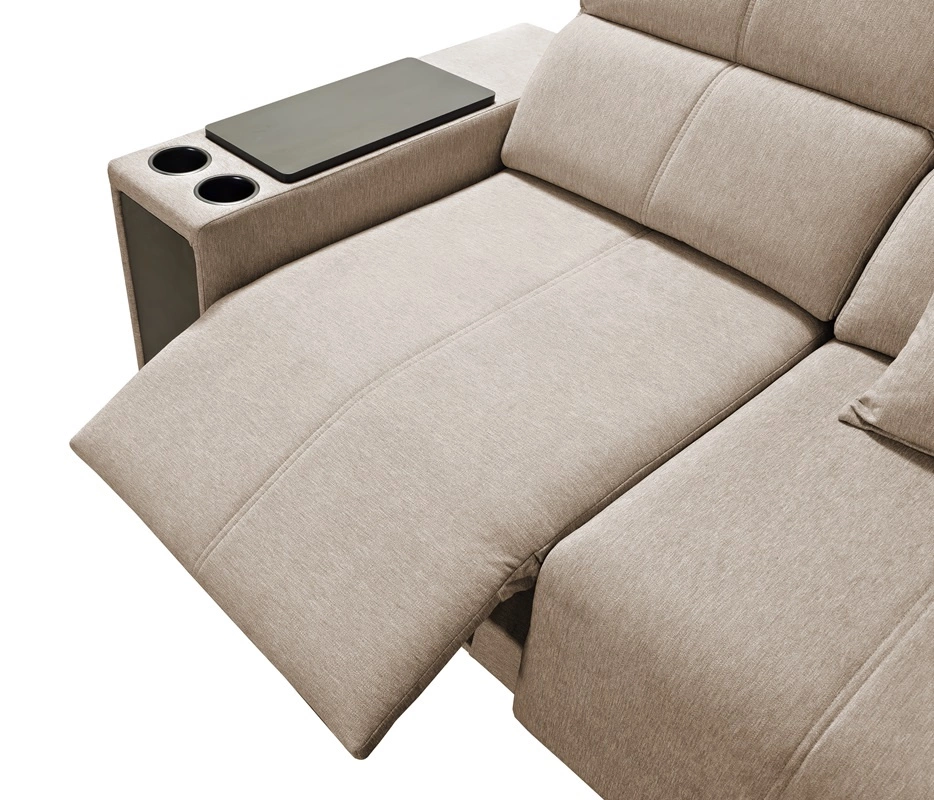 Dodatki tego mebla, które docenią wszyscy użytkownicy to wysuwany podnóżek, regulowane oparcia pozwalające dopasować głębokość siedziska, szuflada i otwierany barek w boczku narożnika, gniazdo ładowania USB, uchwyty na kubki oraz pojemnik na pościel.