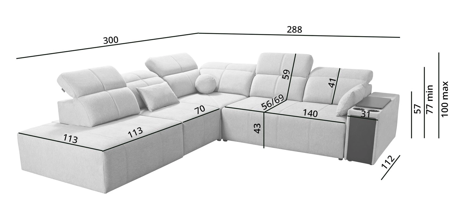 Wymiary mebla pozwolą na zapełnienie przestrzeni w przestronnym salonie lub pokoju dziennym. Szerokość narożnika 288 cm, wysokość maksymalna 100 cm oraz głębokość 300 cm. Powierzchnia spania narożnika wynosi 138x212 cm. Wysokość siedziska mebla to 43 cm a maksymalna wysokość oparcia wynosi 59 cm. Sprężyny faliste oraz pianka poliuretanowa T30 to materiał, z którego wykonane zostało siedzisko narożnika. Oparcie z regulowanymi zagłówkami pozwoli na łatwe dostosowanie kąta nachylenia zagłówków do swoich preferencji oraz daje gwarancję wygodnego wypoczynku po długim dniu, które docenisz Ty, Twoi bliscy a także goście, którzy zasiądą na tym wyjątkowym narożniku.