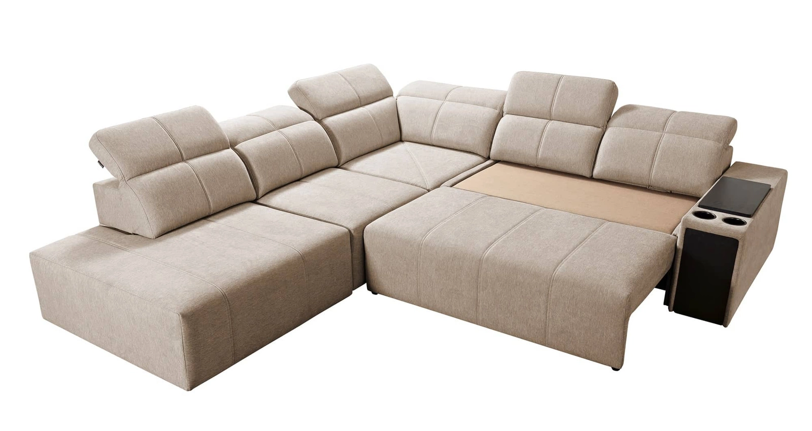 Dodatki tego mebla, które docenią wszyscy użytkownicy to regulowane oparcia pozwalające dopasować głębokość siedziska, szuflada i otwierany barek w boczku narożnika, gniazdo ładowania USB, uchwyty na kubki oraz dwa pojemniki na pościel.