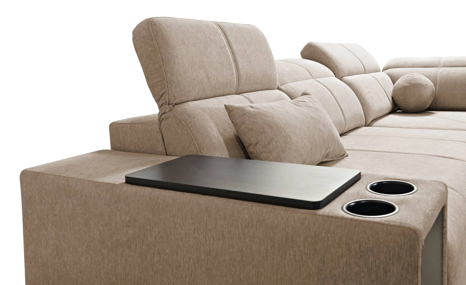 Dodatki tego mebla, które docenią wszyscy użytkownicy to regulowane oparcia pozwalające dopasować głębokość siedziska, szuflada i otwierany barek w boczku narożnika, gniazdo ładowania USB, uchwyty na kubki oraz dwa pojemniki na pościel.