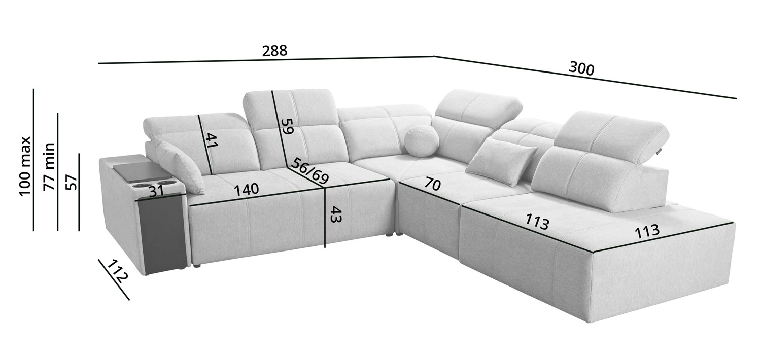 Wymiary mebla pozwolą na zapełnienie przestrzeni w przestronnym salonie lub pokoju dziennym. Szerokość narożnika 288 cm, wysokość maksymalna 100 cm oraz głębokość 300 cm. Powierzchnia spania narożnika wynosi 138x212 cm. Wysokość siedziska mebla to 43 cm a maksymalna wysokość oparcia wynosi 59 cm. Sprężyny faliste oraz pianka poliuretanowa T30 to materiał, z którego wykonane zostało siedzisko narożnika. Oparcie z regulowanymi zagłówkami pozwoli na łatwe dostosowanie kąta nachylenia zagłówków do swoich preferencji oraz daje gwarancję wygodnego wypoczynku po długim dniu, które docenisz Ty, Twoi bliscy a także goście, którzy zasiądą na tym wyjątkowym narożniku.