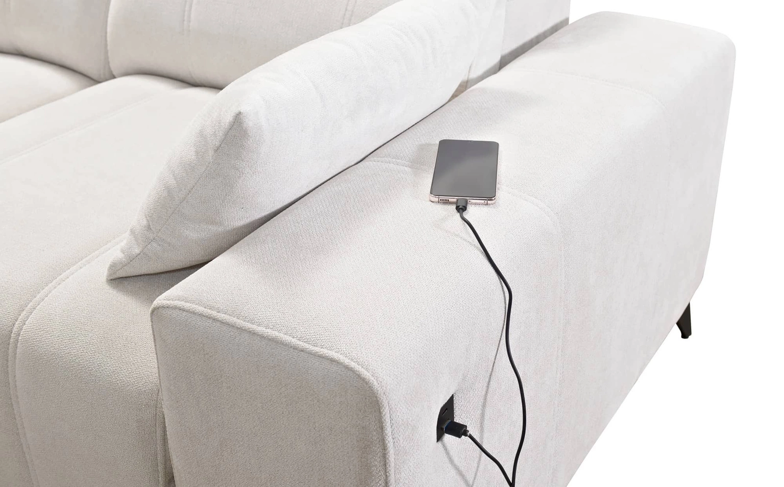 Dodatki tego mebla, które docenią wszyscy użytkownicy to pojemniki na pościel, funkcja spania oraz gniazdo ładowania USB w boczku narożnika.