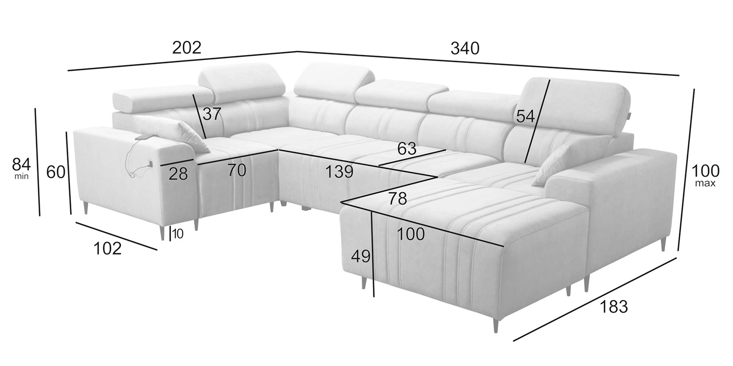 Wymiary mebla pozwolą na zapełnienie przestrzeni w przestronnym salonie lub pokoju dziennym. Szerokość narożnika 340 cm, wysokość maksymalna 100 cm oraz głębokość 202 cm. Powierzchnia spania narożnika wynosi 132x268 cm. Wysokość siedziska mebla to 49 cm a maksymalna wysokość oparcia wynosi 54 cm. Sprężyny faliste oraz pianka poliuretanowa T30 to materiał, z którego wykonane zostało siedzisko narożnika. Oparcie stałe z regulowanymi zagłówkami pozwoli na łatwe dostosowanie kąta nachylenia zagłówków do swoich preferencji oraz daje gwarancję wygodnego wypoczynku po długim dniu, które docenisz Ty, Twoi bliscy a także goście, którzy zasiądą na tym wyjątkowym narożniku.