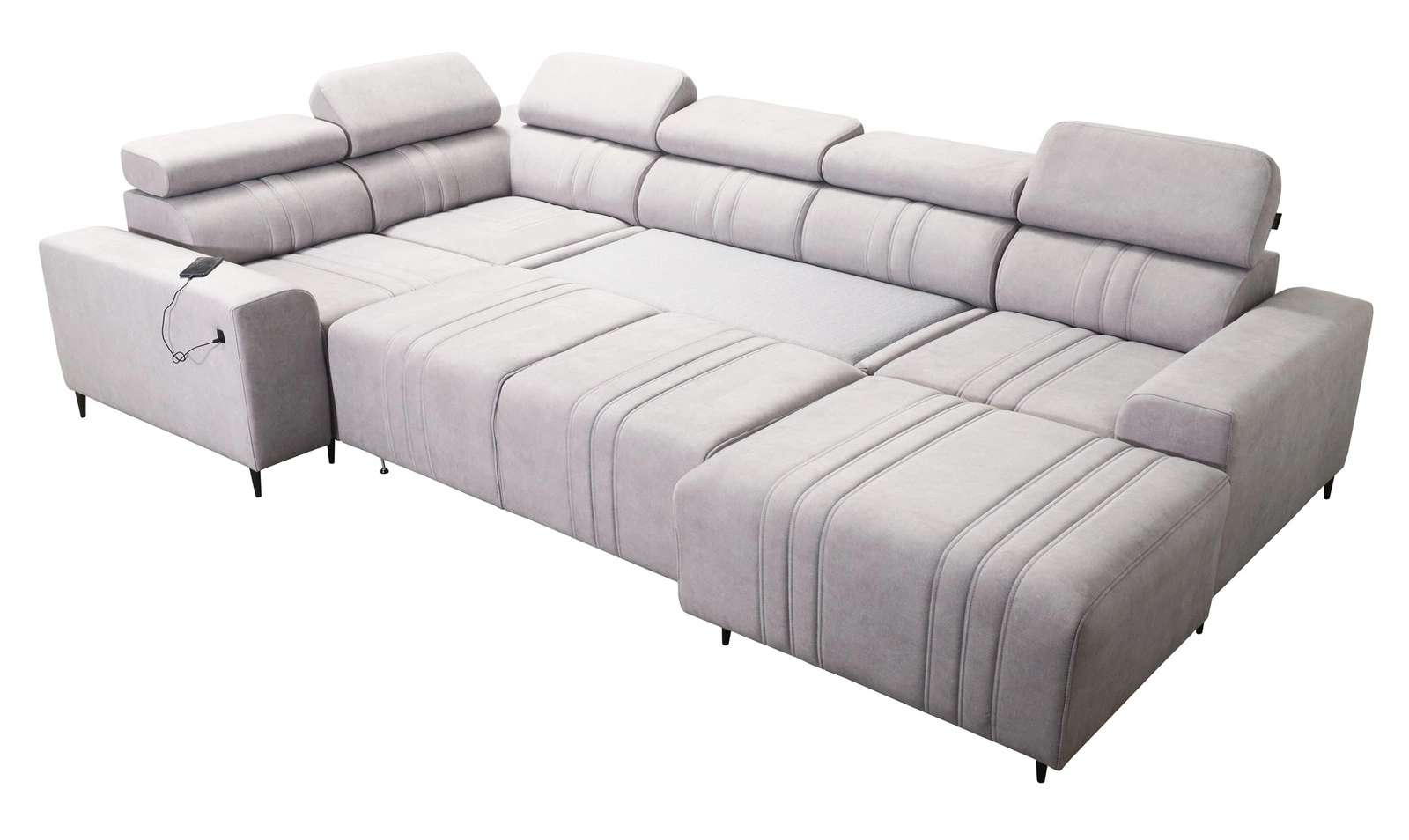 Dodatki tego mebla, które docenią wszyscy użytkownicy to pojemniki na pościel, regulowane zagłówki oraz gniazdo ładowania USB w boczku narożnika.