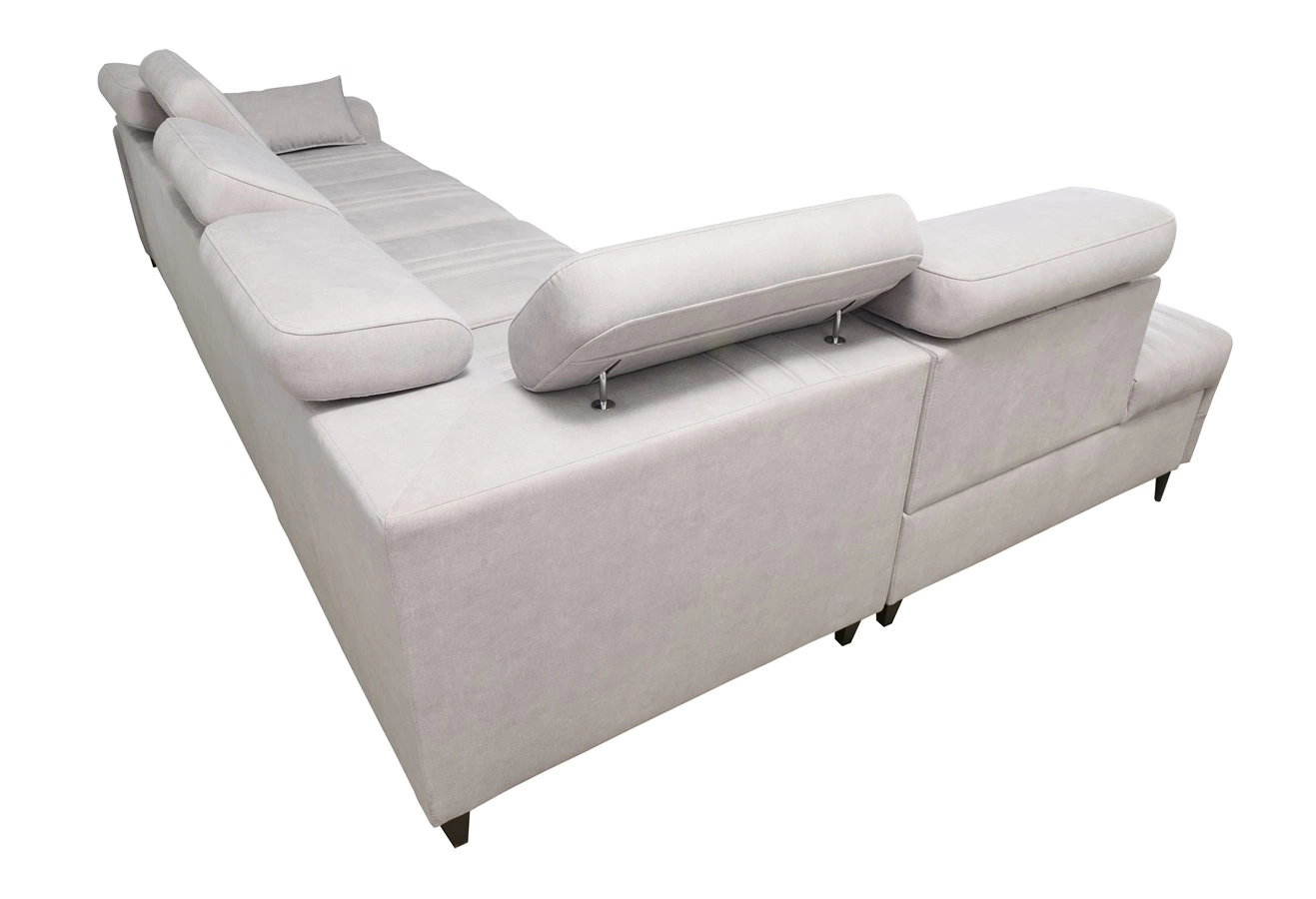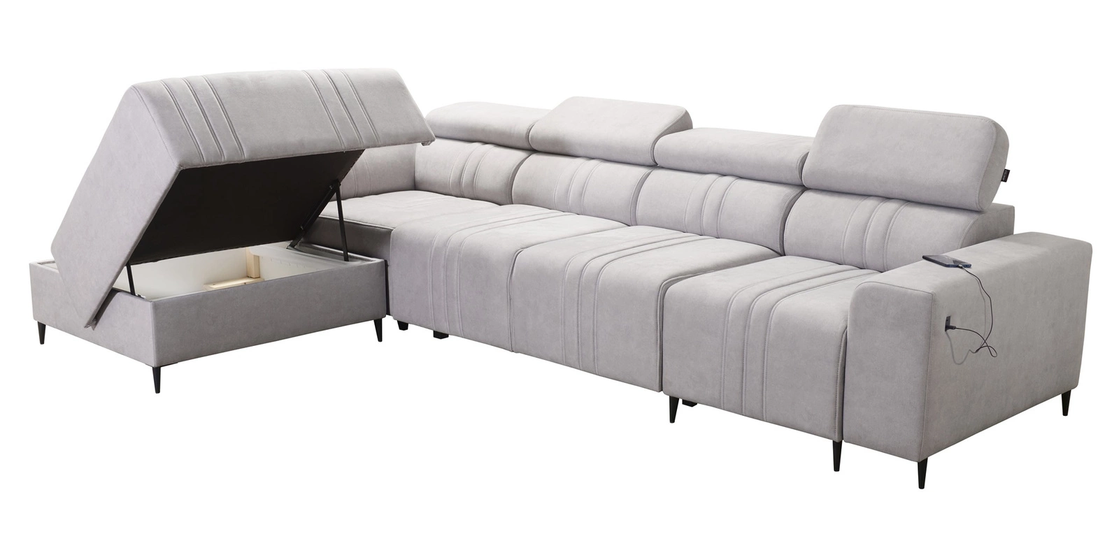 Dodatki tego mebla, które docenią wszyscy użytkownicy to pojemnik na pościel, regulowane zagłówki oraz gniazdo ładowania USB w boczku narożnika.